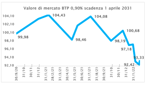 Il grafico che segue si riferisce alla quotazione del BTP decennale emesso il 30 giugno 2021 con cedola lorda pari allo 0,90% e data di rimborso fissata al 1° aprile 2031.