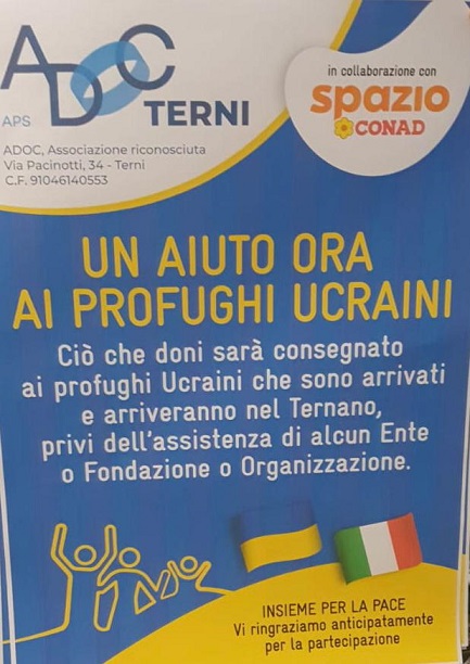 TERNI – Una raccolta di beni alimentari e oggetti d’uso personale a favore dei profughi ucraini che arrivano nella zona del ternano, privi di assistenza e ospiti di persone nel territorio, questo al centro dell’iniziativa promossa da un gruppo di volontari di terni, coordinati da Alessia Antonelli, presidente provinciale di Adoc Terni, e da Mauro Scarpellini, già amministratore unico delle Farmacie comunali locali.