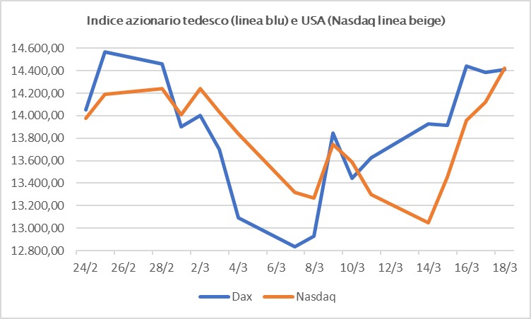 Come riporta la didascalia, la curva blu rappresenta le variazioni dell’indice azionario tedesco rilevate dal 24 febbraio, data dell’inizio dell’invasione russa in Ucraina, al 18 marzo, quattro giorni fa. Si tratta di una sintesi dei primi giorni di guerra, letta dal punto di vista dei mercati finanziari tra i più importanti, rispettivamente, in Eurozona e negli Stati Uniti. In fase di pandemia, pur alla luce di tensioni sanitarie non certo di secondo piano, simili variazioni, che testimoniano incertezza, nervosismo e timori, alternati a momenti di ottimismo. Al punto che, in quell’arco temporale preso in esame, l’indice d’oltre Atlantico è salito. Rispetto al giorno d’inizio invasione. Si potrebbe obiettare: la guerra è nel vecchio Continente. Come spesso, ahinoi! E per citare Giovan Battista Vico, filosofo d’altri tempi, la storia si ripete sempre uguale, anche se con diverse sembianze. Investire in titoli azionari, alla luce di variazioni dei valori di mercato pressoché continui, sia in rialzo, sia in ribasso, è una strategia per cuori forti, molto forti. Ma, soprattutto, per chi, nelle fasi di arretramento delle quotazioni, ha la disponibilità finanziare di acquistare azioni di società, con un obiettivo di medio o lungo termine. Pensate alle società di costruzioni per il post guerra. O alle aziende che producono armi, anche se i loro prezzi di marcato hanno già percorso un cammino non lunghissimo, ma neppure breve. A molti investitori piace investire in beni rifugio, oro in primo luogo, ma anche, e non sarebbe la prima volta, petrolio.