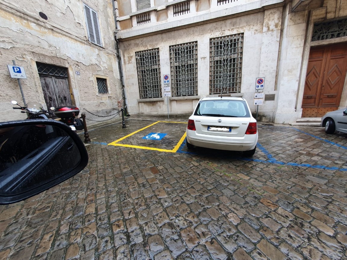 Si riferisce ai tre parcheggi posti affianco al Comune di Narni e a un quarto, più nascosto, posizionato nell’angolo più in alto della svolta dove prima c’era la sede di Banca Intesa. Escluso uno solo di questi, nessuno dei restanti presenta traccia effettiva del rispetto normativo, interamente lasciati alla discrezione del comune. Sempre Sguigna fa anche notare la problematica di un parcheggio aggiuntivo per le ricariche elettriche accanto agli altri. Come suggerito dal sindaco Francesco De Rebotti, tale posto è in effetti destinato anche alle persone affette da disabilità dotate di autovetture più green, ma il problema resta sempre lo stesso: lo spazio per chi è costretto in carrozzina è poco.