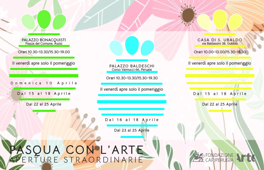 PERUGIA – Dopo due anni di pandemia la Fondazione CariPerugia Arte è di nuovo pronta ad accogliere cittadini e turisti con aperture straordinarie dei suoi musei e visite guidate a tema in occasione delle festività pasquali e del ponte del 25 aprile, nel rispetto delle nuove norme anti-covid che hanno eliminato l’obbligo del green pass per accedere ai musei, pur mantenendo obbligatorio l’uso della mascherina.