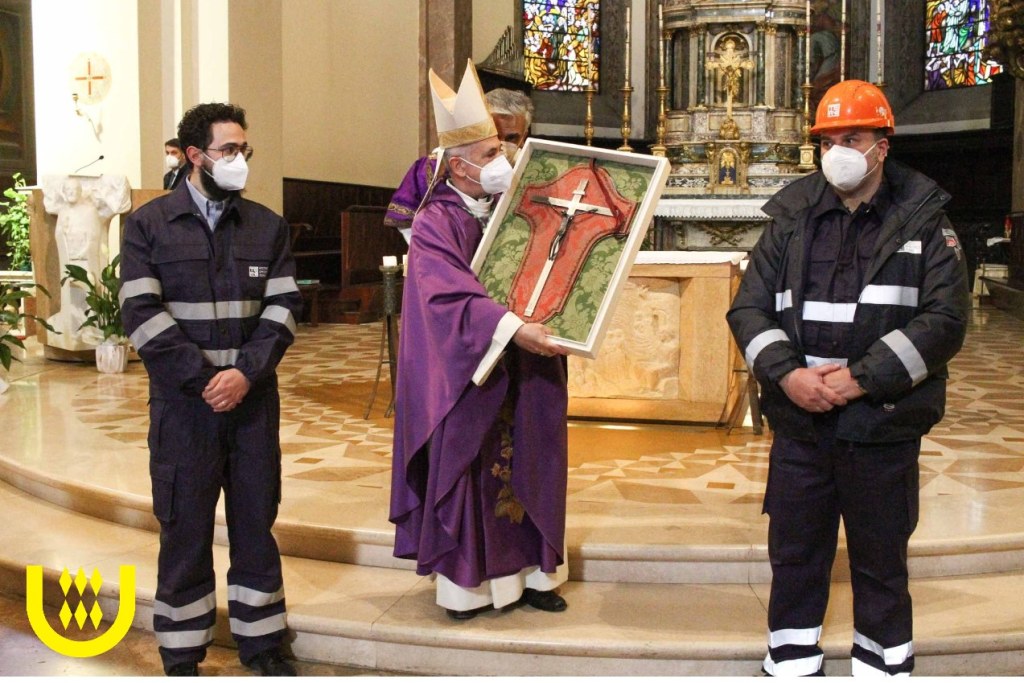 Al termine della cerimonia, due operai di Ast hanno donato al vescovo Soddu un crocifisso realizzato dall’acciaieria Arvedi di Cremona.