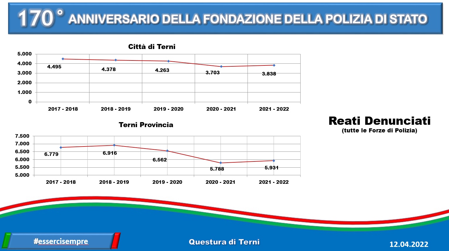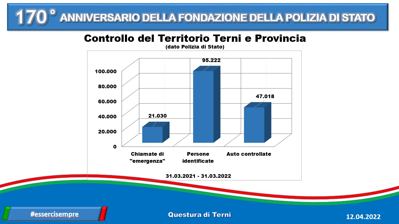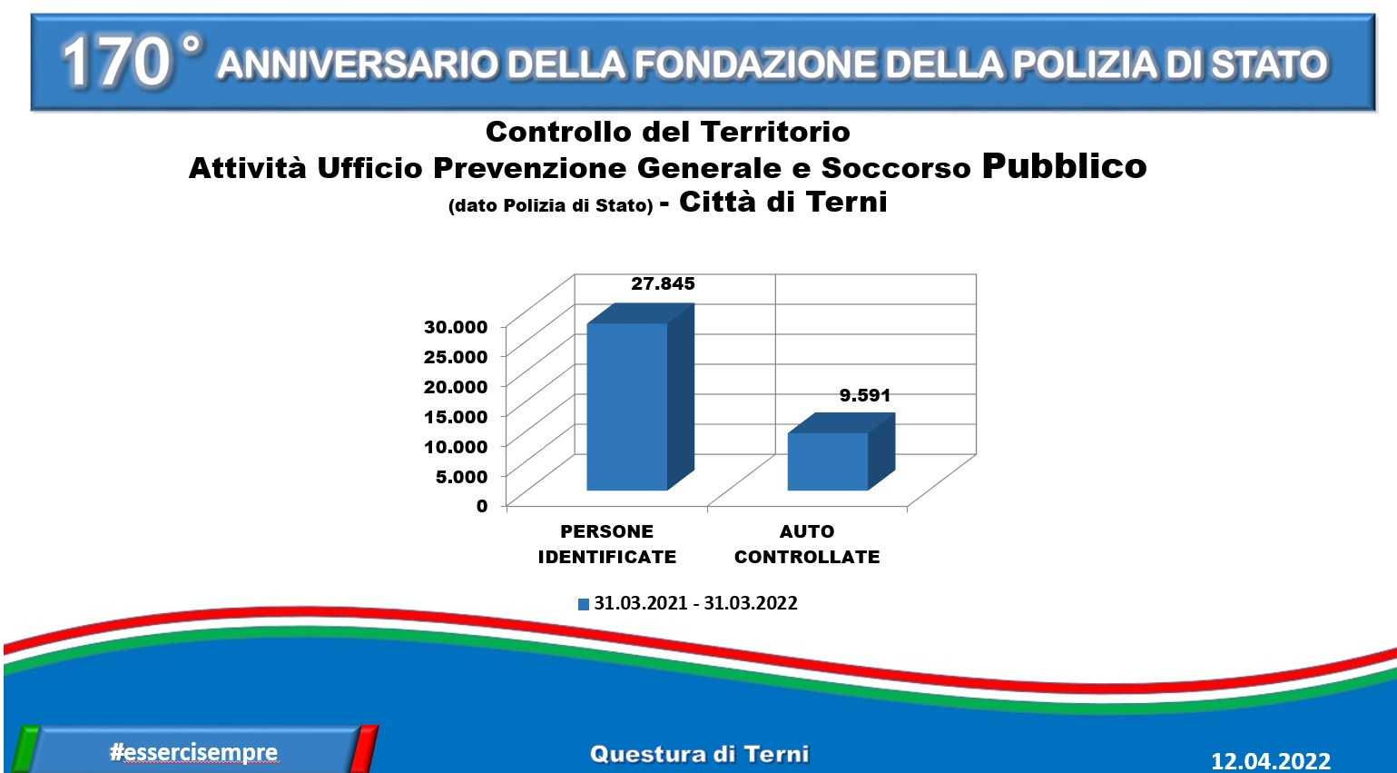 Anche a Terni si festeggia. Le celebrazioni, in città, si stanno tenendo al Caos, nel teatro Secci, tra premiazioni e interventi – come quello del questore Failla – che hanno interessato l’intera mattinata, davvero ricca di eventi. Nel giorno dei 170 anni della fondazione della polizia di Stato, escono anche i dati (che trovate nella gallery in calce alla notizia) relativi all’attività di prevenzione generale, alle denunce, chiamate e arresti registrati nell’ultimo anno, dal 31 marzo 2021 al 31 marzo 2022.