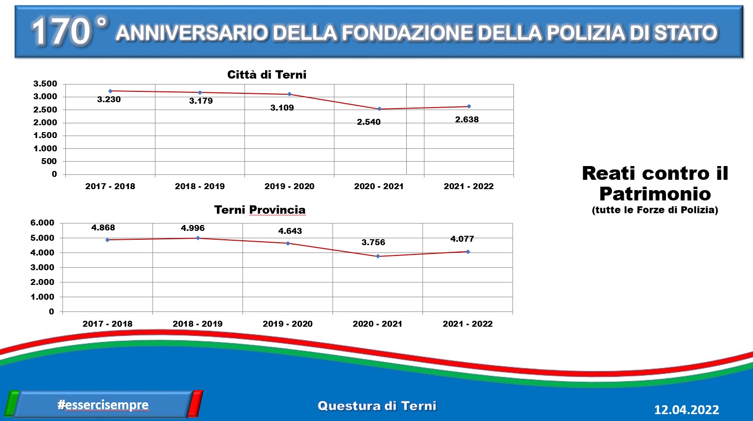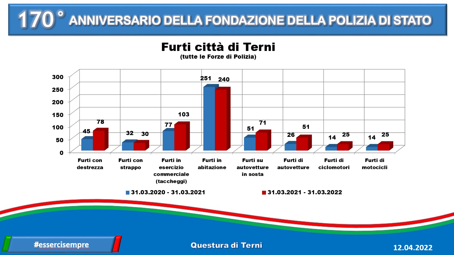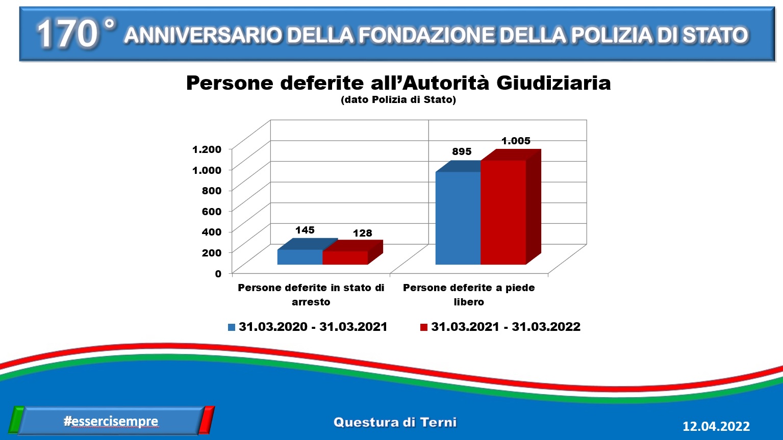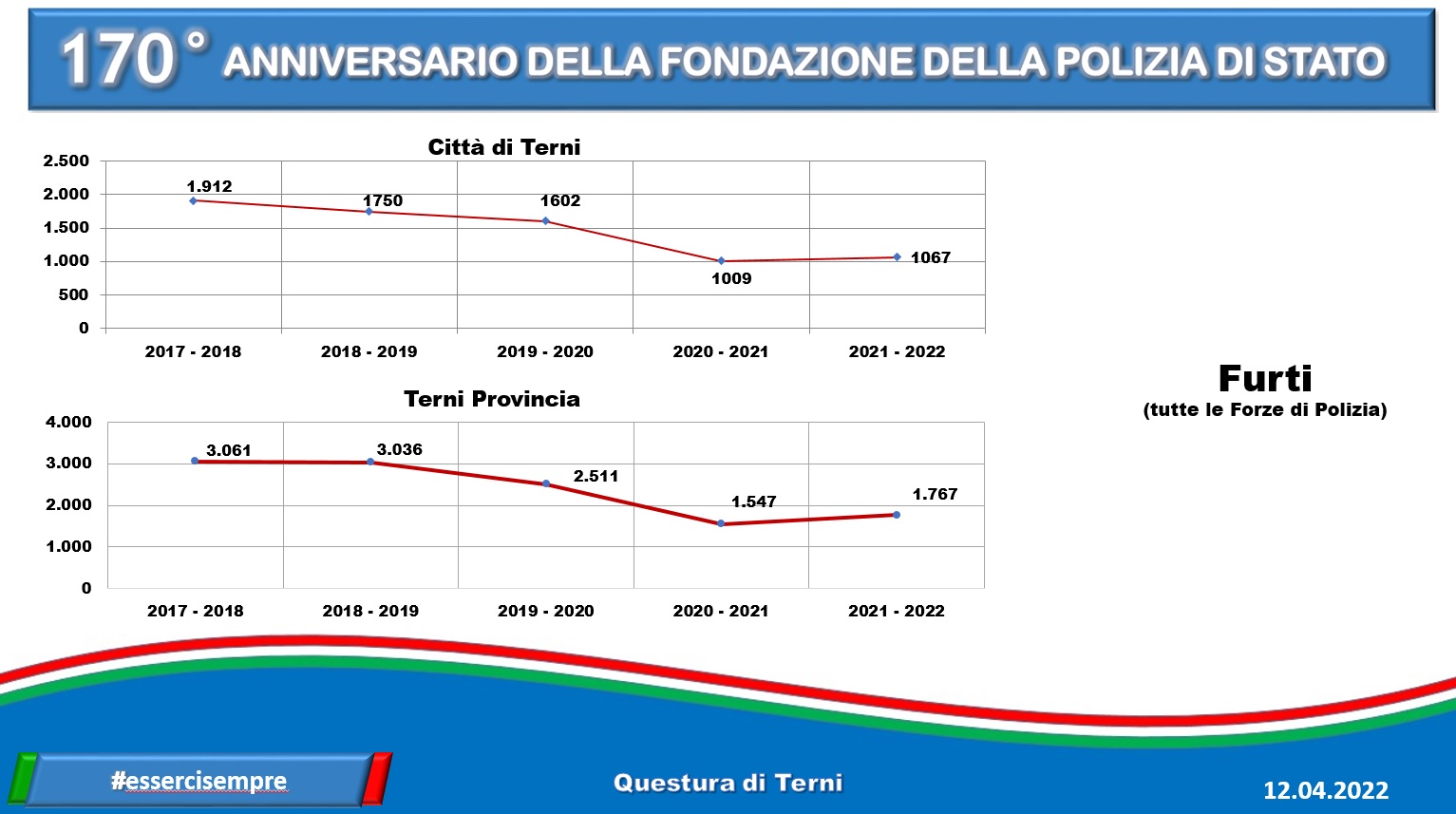 Anche a Terni si festeggia. Le celebrazioni, in città, si stanno tenendo al Caos, nel teatro Secci, tra premiazioni e interventi – come quello del questore Failla – che hanno interessato l’intera mattinata, davvero ricca di eventi. Nel giorno dei 170 anni della fondazione della polizia di Stato, escono anche i dati (che trovate nella gallery in calce alla notizia) relativi all’attività di prevenzione generale, alle denunce, chiamate e arresti registrati nell’ultimo anno, dal 31 marzo 2021 al 31 marzo 2022.