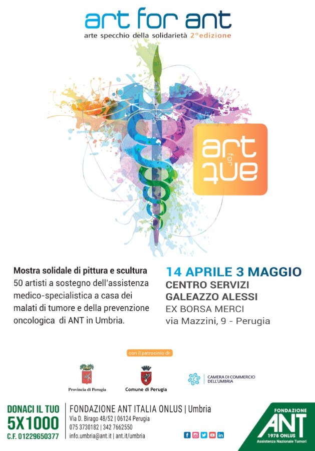 PERUGIA – L’arte specchio della solidarietà, grazie a “Art for Ant”, la mostra aperta fino al 3 maggio al Centro servizi Galeazzo Alessi della ex Borsa merci