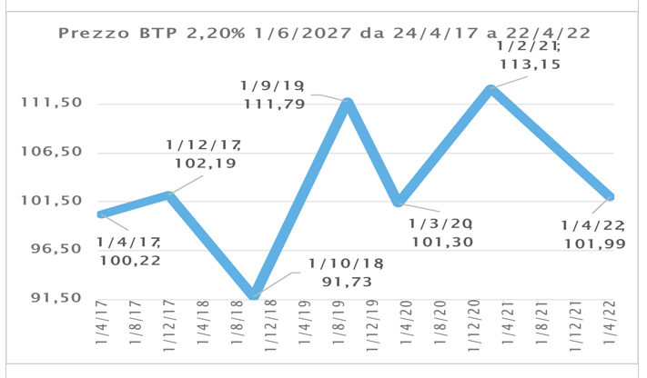 Ora è curioso che quando si fa riferimento ai mercati finanziari in crisi si pensi solo ed esclusivamente al mercato azionario. Quando le quotazioni dei titoli obbligazionari, sia governativi, sia societari stanno sensibilmente diminuendo, a causa del continuo incremento dei rendimenti di mercato. Le emissioni obbligazionarie a lunga durata ne risentono in misura maggiore, mentre quelle brevi, le biennali, molto meno, ma i loro prezzi tendono e tenderanno, come le consorelle con più anni davanti a sé, a scendere via via. Il grafico, relativo ad una scadenza quinquennale (circa a metà strada tra 2 e 10 anni di durata) è esplicativo!