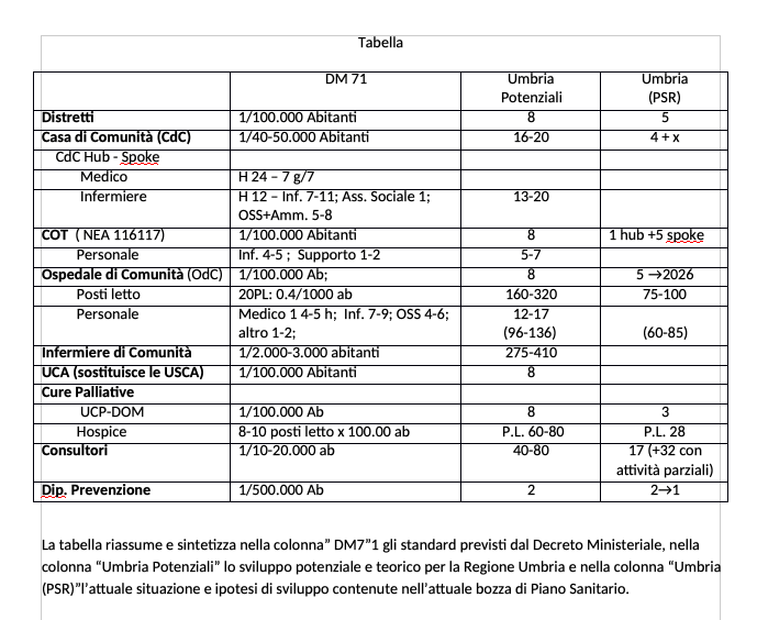 L’Umbria è impegnata in questi mesi a discutere ed approvare il nuovo Piano Sanitario Regionale per il quinquennio 2021-2025. La preparazione del Piano è stata preceduta da una rilevazione approfondita delle condizioni di partenza al 2019 e riportate nel libro bianco. Nel complesso la maggior parte delle attività territoriali in Umbria risultano sotto dimensionate rispetto agli standard nazionali, come è possibile vedere dalla tabella nella quale sono evidenziate gli standard nazionali di riferimento contenuti nel DM71, le potenzialità di sviluppo per l’Umbria e gli impegni contenuti nel documento di piano sanitario, almeno per quei parametri che sono formalmente declinati. (vedi Tabella)