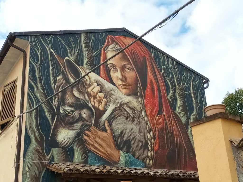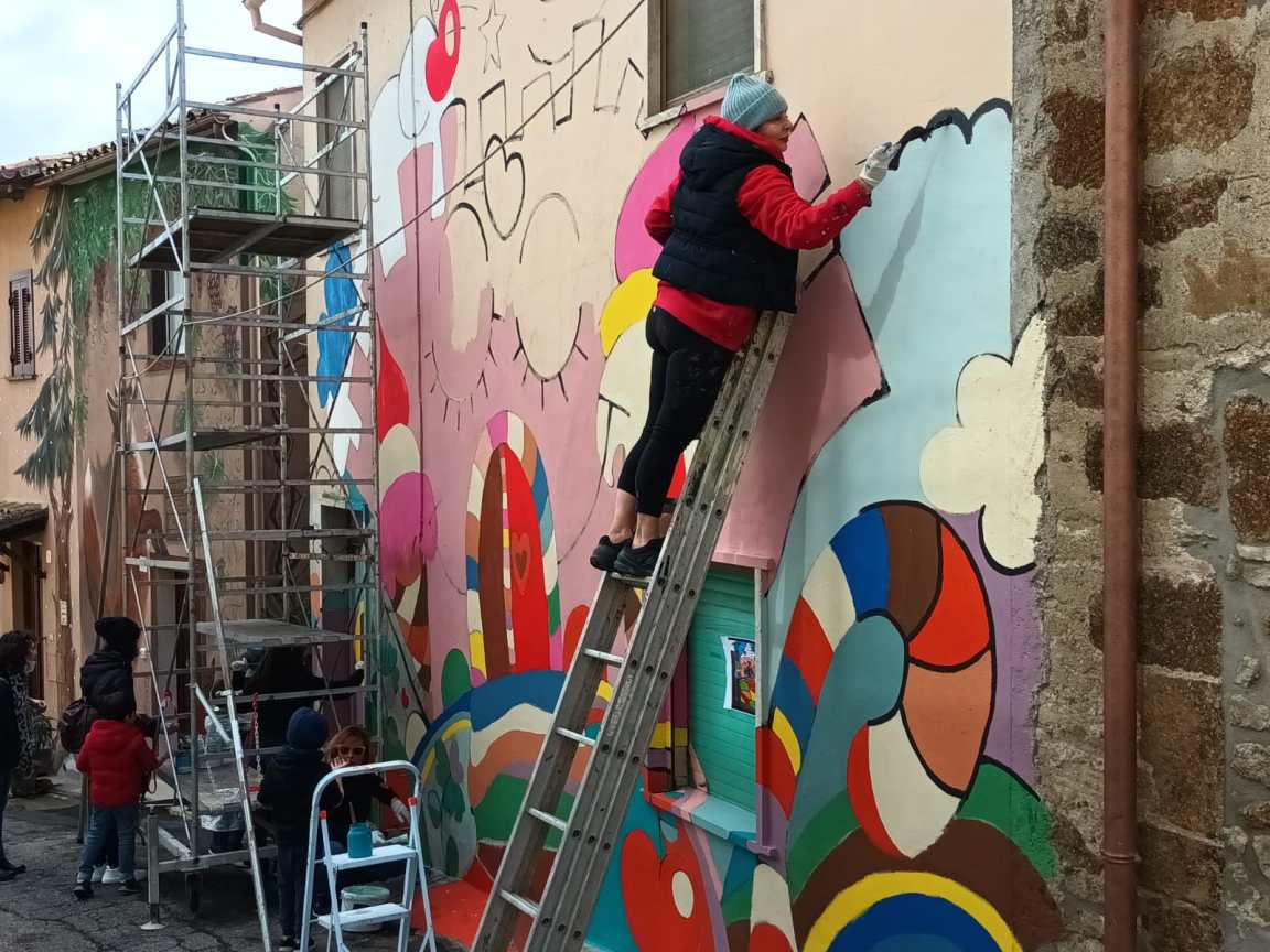 lo Zoo di Simona Angeletti ha iniziato a realizzare il palazzo del gelato di Bologna che prende spunto da una fiaba di Rodari. Il murales di Simona ha al suo interno delle ciliegie, è supportato dall’associazione dei coltivatori di ciliegia. Il paesino del viterbese, 250 abitanti circa era in via di abbandono totale cinque anni fa, gli abitanti hanno cercato di riaprire le attività, aperte due case vacanze e bar. Nel weekend raggiunge fino a 3000 presenze. Lo zoo di Simona ha iniziato la creazione. Simona disegna e gli altri colorano con murales e riproduzione di immagini di fiabe iniziata nel 2018 con Tina Loiodice. Presenti con Simona circa venti collaboratori. Alessandro Chiovelli è l’ideatore dei murales fin dall’inizio. “Le donne colorano tutte le immagini, è la peculiarità dell’iniziativa”.
