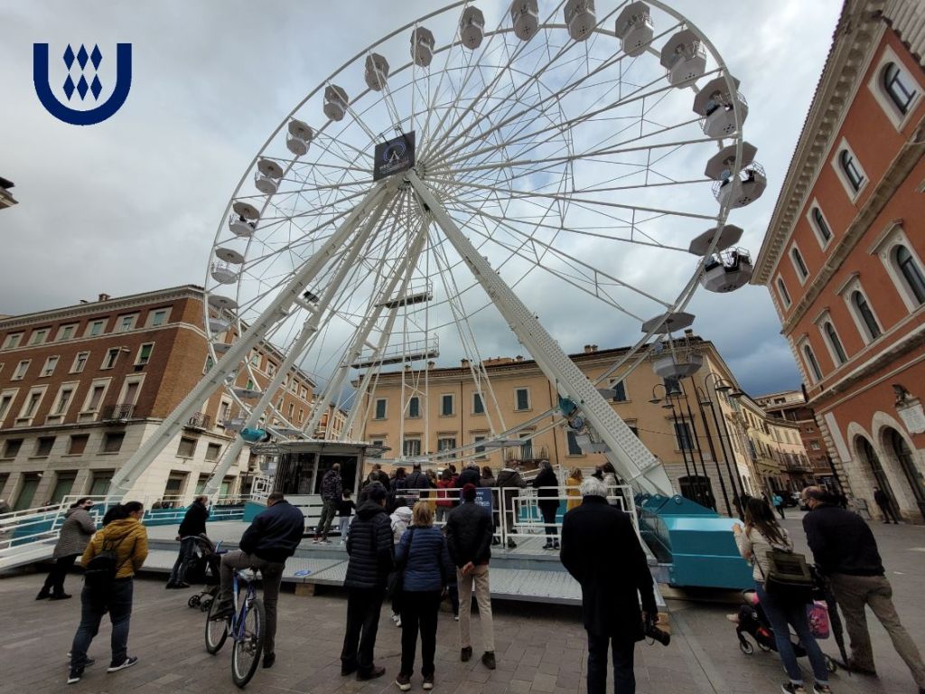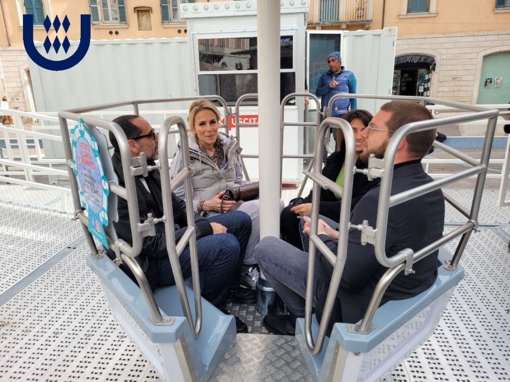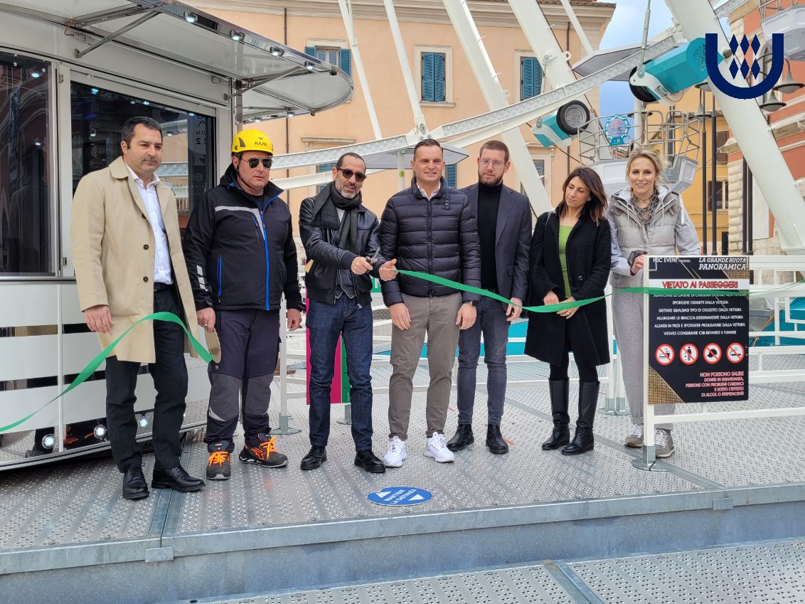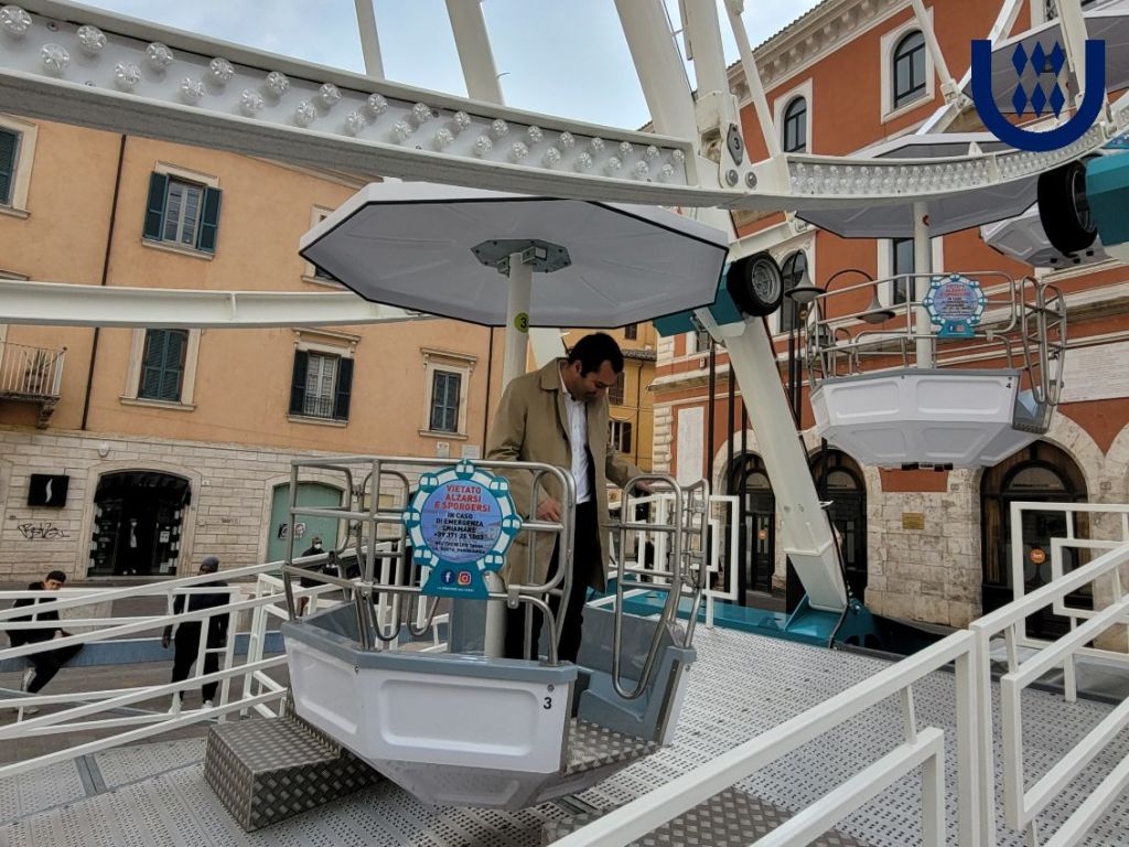 Uscito dalla quarantena causa Covid, il primo cittadino di Terni ha inaugurato la ruota panoramica in piazza della Repubblica, che per due mesi (costo del biglietto 8 euro adulti, 6 euro ridotto) permetterà di poter vedere la città a 34 metri di altezza. Presente insieme al sindaco la giunta comunale, i rappresentanti di Palazzo Spada hanno effettuato i primi giri sulla ruota mentre la piazza, nonostante le non ottimali condizioni meteorologiche, andava via via riempiendosi. Così ha iniziato a girare una delle attrazioni turistiche più discusse dell’ultimo periodo a Terni, e lo farà per due mesi con i seguenti orari di apertura: lunedì-giovedì dalle 14 alle 20, venerdì-sabato dalle 10 alle 24, domenica dalle 10 alle 20). Ora, dopo averla vista illuminata di sera con i colori rossoverdi tanto cari alla città, non resta che aspettare il responso di turisti e cittadini alla novità.
