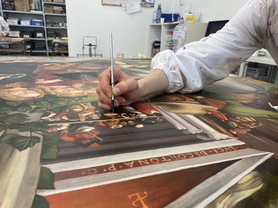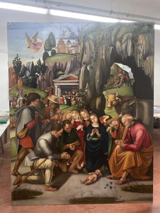 Il “Signorelli” ritrovato: una riproduzione de “l’Adorazione dei Pastori” ricollocata a Città di Castello nella chiesa di San Francesco, in pieno centro storico, dove era stata realizzata nel 1496 dal grande maestro del Rinascimento. Stesse dimensioni, cm 215X170,2, stessa tecnica ed identica collocazione, l’opera che è stata scoperta ufficialmente questo pomeriggio nell’ambito di una partecipata cerimonia, su iniziativa dell’Associazione Chiese Storiche, è stata realizzata dalla Bottega Tifernate, dal maestro Stefano Lazzari e dal suo qualificato staff, in “pictografia” dipinta ad olio su tavola. Un lavoro certosino, di rigore storico e tecnica unica nel suo genere durato sei mesi che rientra nel percorso formativo della “bottega” fondata oltre trenta anni fa allo scopo di ricreare opere d’arte che permettano di vivere l’emozione dell’originale. L’uso di pigmenti molto simili a quelli originali e lo studio fatto direttamente sull’opera hanno permesso di riprodurne esattamente ogni dettaglio cromatico ed estetico. “Ricollocare un’opera nella sua ubicazione di origine – dichiara il maestro Stefano Lazzari, nel corso dell’anteprima alla stampa, affiancato dalla sorella Francesca e dal padre Romolo con cui condivide la conduzione dell’azienda – non significa restituire l’originale: certamente, la pictografia, è la tecnica conosciuta più fedele che oggi si conosca per questo fine perché utilizza la tecnologia al servizio del lavoro dell’uomo. Solo attraverso lo studio, la ricerca e l’esperienza dei metodi antichi si può tentare di trasmettere allo spettatore una visione veritiera di un’opera non più visibile come nel caso dell’Adorazione dei Pastori, ormai fuori da Città di Castello da più di due secoli”. Un lavoro importante che anticipa le celebrazioni del cinquecentenario dalla morte del Signorelli e del Perugino previste nel 2023 che coinvolgeranno indirettamente anche Città di Castello, la città di Raffello e di altri grandi maestri del Rinascimento. La Bottega Tifernate sta lavorando alla ricreazione di altri quadri di questi grandi maestri che saranno ricollocati nelle loro sedi di origine entro questa data. Il dipinto raffigura l’episodio narrato nel Vangelo di Luca in cui i pastori, dopo aver ricevuto l’annuncio dall’angelo del Signore, accorrono per adorare il piccolo Gesù appena nato. Fulcro della composizione è il piccolo bambino che giace a terra con il capo sorretto da un cuscino. Vasari cita questa tra le opere del pittore e sappiamo che a metà del Settecento era sulla cappella Tiberti, la seconda sulla destra, in San Francesco, mentre, molto probabilmente, in origine si trovava nella navata superiore, di fronte allo Sposalizio della Vergine di Raffaello. L’Adorazione, firmata “LVCE DE CORTONA”, è datata in base all’analisi stilistica al 1496. “Siamo in anni di piena attività del pittore per Città di Castello – precisa Francesca Mavilla, storica dell’arte – che poco prima aveva dipinto l’Adorazione dei Magi per Sant’Agostino (1493), la Natività Feriani (1494 ca.) per la stessa chiesa e poi il Martirio di San Sebastiano in San Domenico (1498). Anni nei quali Signorelli dimostra di essere divenuto non solo il pittore di riferimento della famiglia Vitelli, per la quale realizza i ritratti di Niccolò e i figli, ma dell’intera nobilitas tifernate che sceglie di abbellire il proprio altare con le sue opere. Presso il British Museum è conservato un disegno a carboncino dei tre pastori sulla sinistra e un angelo, utilizzato da pittore per riportare su tavola il dipinto (Londra, British Museum, inv. 1895,0915.602 recto). Venduta dai frati agli inizi dell’Ottocento, nel 1882 – conclude Mavilla – l’Adorazione dei Pastori fu acquistata dalla National Gallery di Londra”. Da oggi dunque la chiesa di San Francesco torna ad offrire a turisti e visitatori la visione di opere che hanno fatto la storia dell’arte rinascimentale. La chiesa di San Francesco è uno dei luoghi più significativi della storia ecclesiale e culturale di Città di Castello. Edificata nel corso del XIII secolo e successivamente ampliata tra XIV e XV, ha assunto la sua fisionomia attuale nella prima metà del XVIII e ormai da quasi ottocento anni rappresenta un punto di riferimento significativo nella vita cittadina. Fino al 2016 ha ospitato una comunità di Frati Minori Conventuali e oggi continua a essere chiesa parrocchiale; sebbene non più officiata quotidianamente è sempre molto frequentata, sia per la preghiera personale che per la visita turistica. “La sua fama – sottolinea, don Andrea Czortek, parroco di San Francesco, direttore beni culturali Diocesi di Città di Castello – è legata al fatto di avere ospitato, fino al 1798, il celebre “Sposalizio della Vergine”, dipinto da Raffaello Sanzio nel 1504. Di questa opera nel 2020, per iniziativa di un nostro concittadino e dell’amministrazione comunale, è stata collocata una riproduzione tecnologica. Adesso la chiesa acquisisce un’altra copia di un’opera, l'”Adorazione dei pastori” che Luca Signorelli, attorno all’anno 1496, aveva dipinto per la stessa chiesa. I nomi di san Francesco d’Assisi, Luca Signorelli, Raffaello Sanzio ci parlano di una plurisecolare storia di fede, arte e cultura; una storia che noi abbiamo ereditato e che oggi siamo chiamati a fare nostra e a proseguire, per trasmettere alle generazioni contemporanee i valori del bene e il gusto per il bello che hanno impreziosito la nostra storia. Come parroco ringrazio tutti coloro che, singoli cittadini o associazioni, si stanno adoperando affinché San Francesco continui a essere un luogo accogliente per i numerosi fedeli, pellegrini e turisti che durante l’anno frequentano in gran numero questa nostra chiesa”. “La chiesa in questione è uno degli edifici che meglio rappresenta Città di Castello, in essa hanno lavorato decine di artisti che ne hanno fatto