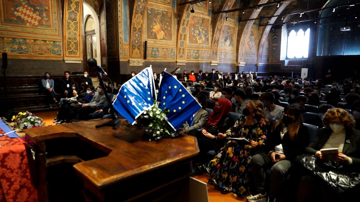PERUGIA – Una settimana per pensare, riflettere, immaginare un futuro di cui essere parte attiva in quanto cittadini ed europei, guardando alla pace e al lavoro come momenti fondamentali. Con questo spirito gli studenti dell’Istituto tecnico tecnologico statale Alessandro Volta di Perugia hanno vissuto la loro Settimana civica, accompagnati dai docenti un una serie di eventi nazionali e locali. Una riflessione sulla visione di un’Europa e di un futuro di pace e sul rispetto della vita è stato il filo conduttore dell’intera Settimana civica che si è aperta con la partecipazione alla Marcia PerugiAssisi ed è proseguita con l’evento nazionale ‘Giovani per un’Europa di pace. Re-immaginiamo insieme il futuro dell’Europa’, alla sala dei Notari di palazzo dei Priori a Perugia.