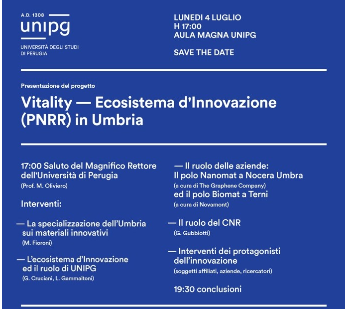 Verrà presentato luned’ 4 luglio alle 17 nell’Aula magna del rettorato dell’università degli studi di Perugia il progetto relativo all’ecosistema d’innovazione Vitality, finanziato con la missione “dalla ricerca all’impresa” del Pnrr (Missione 4, Componente 2, Investimento 1.5).