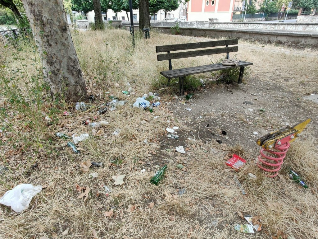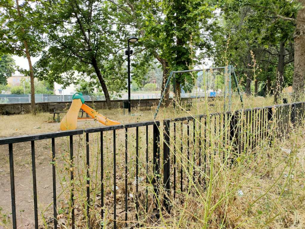 Mentre una bambina si dondola su di un’altalena massacrata dal tempo e dalla negligenza, sotto l’attento occhio dei genitori, tutto intorno si estendo un mare di rifiuti annegati nell’indecoroso giallo di erba incolta e secca, vegetazione morta. «Sarebbe giusto sistemare il parco per la sicurezza dei bambini – ci dice uno dei genitori -. Nella zona è uno dei pochi disponibili e non è adeguato. È un peccato e potrebbe essere molto più bello e vivibile».