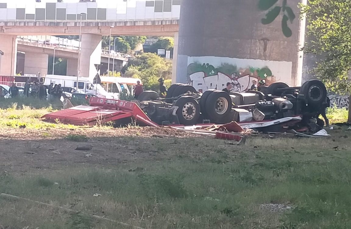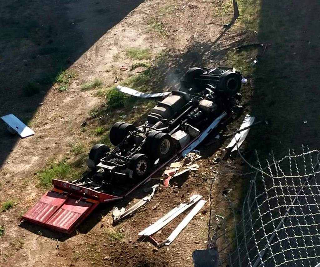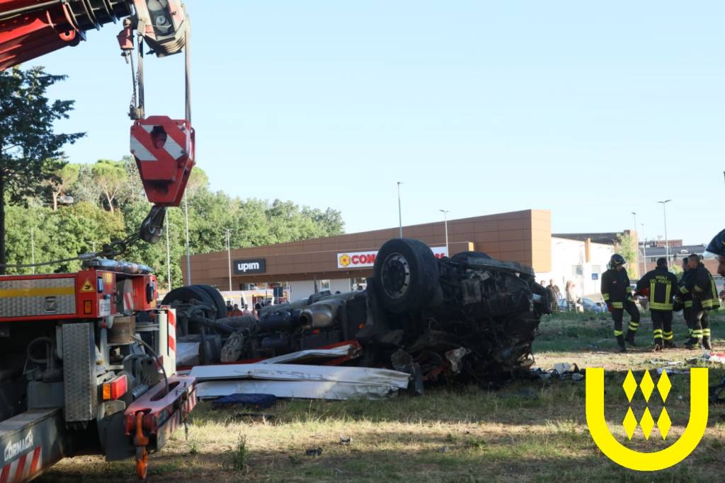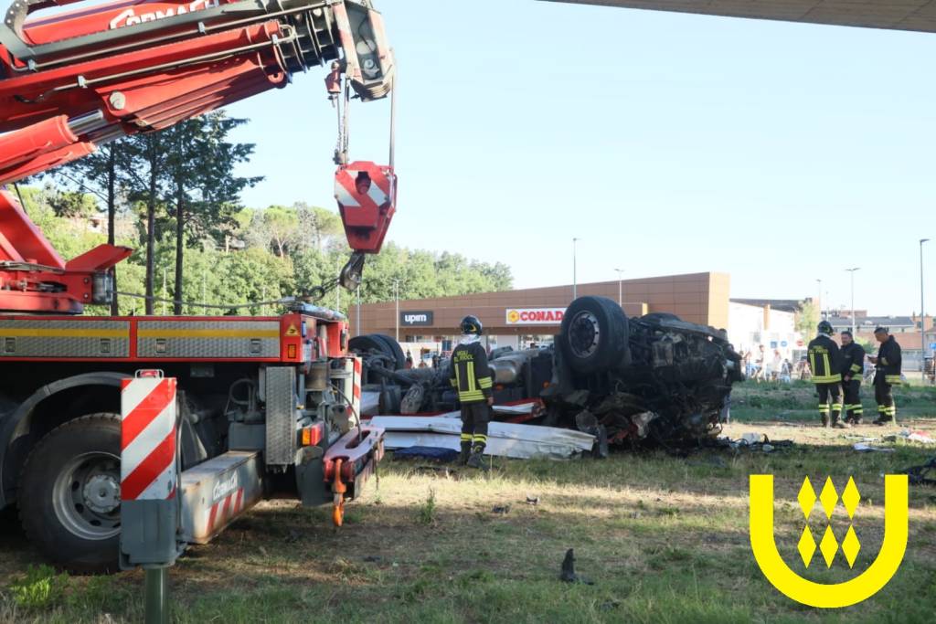 Il traffico in città e superstrada è bloccato, con gravi disagi alla circolazione. Il mezzo pesante per cause ancora in corso di accertamento è caduto dal cavalcavia che passa sopra via Settevalli, finendo in un campo accanto alla zona commerciale.