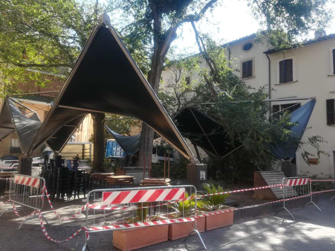 E dopo la tromba d’aria di mercoledì pomeriggio e i timori del progettista riportati questa mattina, si susseguono le reazioni in città. «Su Piazza dell’Olmo non si è abbattuta solo una serata di maltempo eccezionale – è il commento di Francesco Filipponi e Tiziana de Angelis, capogruppo e consigliere comunali del Pd -. Si sta abbattendo anche la furia di questa amministrazione che vuole abbattere e cancellare un intervento di rigenerazione urbana degli anni scorsi. Un intervento che all’epoca ha visto la partecipazione volontaria di decine di operatori economici di quell’area che hanno deciso anche di contribuire economicamente per sistemare una zona ad alta socialità. Un apporto determinante di piccoli imprenditori che hanno consentito di realizzare quell’intervento».