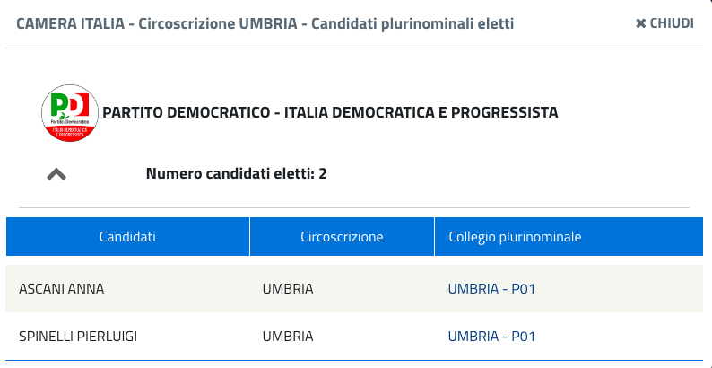 PERUGIA – Colpo di scena sugli eletti (con un piccolo giallo): fonti accreditate del Ministero degli Interni assicurano a Umbria7 che la ripartizione dei seggi degli eletti in Umbria per la Camera (plurinominale) prevede due esponenti di Fratelli d’Italia, Emanuele Prisco e Marco Squarta, e due esponenti del Partito democratico, Anna Ascani e Pierluigi Spinelli.