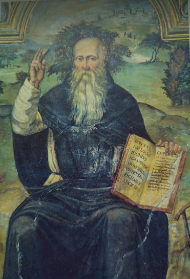 Il dipinto di recente restaurato, che occupa tutta la superficie del nicchione della navata di sinistra, è opera del pittore siciliano Giacomo Santoro da Giuliana detto Jacopo Siculo che lo realizzò nel 1543 con l’altro affresco nella stessa navata altare dedicato a Santa Caterina d’Alessandria. Qui il Santo è raffigurato in cattedra e mostra attorniato da animali domestici; con la mano sinistra mostra un libro aperto dove e espresso il monito agli ecclesiastici: Non Est Hic Locvs Idonevs Nisi Amatorivs Hvivs Specvli, Propterea Fugiamvs A Facie Hvivs Cupititatis. Tutto attorno i miracoli e le storie del Santo raffigurati con abilità ed espressività assoluta, (sullo sfondo il paese di San Mamiliano dove lo stesso