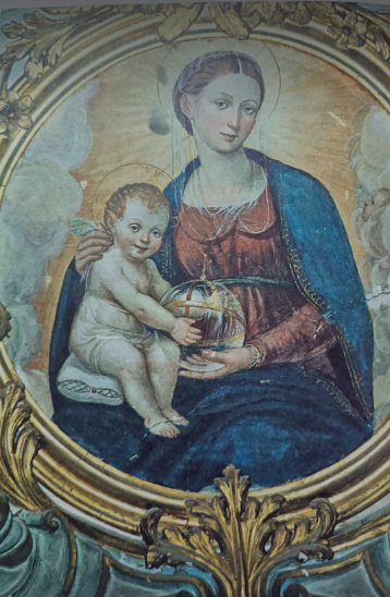 pittore realizzò pochi anni prima, nel 1538 la grande pala di altare con lunetta e predella, olio su tavola, raffigurante la Madonna col Bambino in trono tra Santi). Il dipinto alla Collegiata di Matterella si completa con una stupenda Madonna col Bambino (nella foto) di raffinata dolcezza. Nelle candelabre dell’intradosso tra decorazioni a racemi e uccelli, su una tabella si legge la data dell’esecuzione M.D. XXXXIII. La cappella era di juspatronato dei vetturali, agricoltori e allevatori locali, ciò espresso da rilievi di un piccolo suino, un asino e un cavallo scolpiti sui pilastri laterali delle paraste dagli scalpellini e muratori, (mastri lombardi). In questo dipinto, importantissimo per la storia dell’arte in Umbria,