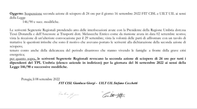 PERUGIA – Quello che vedete è una nota ufficiale di Fit CIsl e Uilt Uil. E avrà conseguenze perché è anche un segnale chiaro: il sindacato si spacca su uno sciopero, non è più unito, come si dice, “a prescindere”.