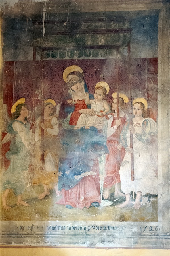 SPOLETO (Perugia) – La chiesa di Santa Maria di Cerasola alla frazione di Belvedere (antico feudo alle dipendenze dell’abbazia di Ferentillo), si presenta con la sua originalità, tra il silenzio e il cinguettio degli uccelli tra torri colombaie. Facciata a capanna con finestra centrale, campaniletto a vela con unica fornice con due campane che scandiscono ancora il tempo con orologio. Portale con piedritti, architrave sorretto da due mensole; sopra all’architrave una lunetta con le iniziali della Vergine Maria. I residenti della frazione chiedono a gran voce di recuperare i dipinti che adornano da più di cinquecento anni le pareti della loro chiesa . Il suo interno si presenta ad unica navata, scandita da due archi. Sulle pareti laterali affreschi rinascimentali attribuiti a Giovanni di Girolamo Brunotti (allievo di Giovanni di Pietro detto lo Spagna): Madonna di Loreto sotto il baldacchino sorretto da angeli e la scritta in basso HOC OPVS F. F. RANALDVS MORICONI PER VOTO 2 OCTOBRIS 1526.