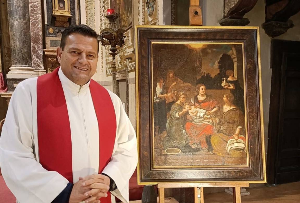 PERUGIA – Arte che si aggiunge all’arte: il dipinto della “Natività della Vergine Maria” attributo a Pietro da Cortona torna restaurato nella chiesa del Gesù, in piazza Matteotti. Cinque mesi di lavoro di restauro finanziati dal Rotary Club Perugia Est con il suo presidente Riccardo Pelliccia ed eseguiti dal maestro Giovanni Manuali, hanno permesso di far tornare a casa l’opera, riaccolta a braccia aperte dal rettore don Mauro Angelini.
