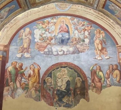conteneva al suo interno preziosissimi affreschi del 1416 c.a di scuola umbro-senese. Gli affreschi ancora oggi, dopo l’ ampliamento del XVI secolo, più precisamente nel 1575, ricoprono tutte le pareti