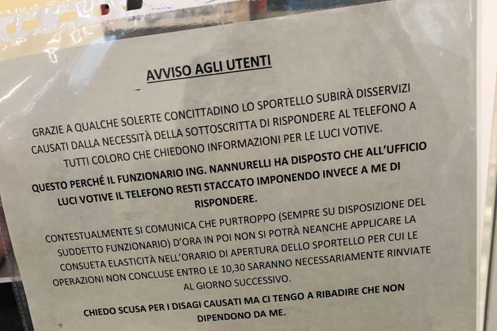 TERNI – «Mi hanno messa al telefono, non posso stare allo sportello». Un messaggio “plastificato“. Un invito a non prendersela con «chi non c’entra». Ma gli utenti in cerca di delucidazioni sulle bollette delle luci votive si dichiarano sorpresi, almeno quanto è stata sorprendente la mossa della povera dipendente comunale di mettere quel cartello sui vetri dell’ufficio che si interfaccia con il pubblico presso il cimitero di Terni. Che riporta: «Grazie a qualche solerte concittadino lo sportello subirà disservizi causati dalla necessità della sottoscritta di rispondere al telefono a tutti coloro che chiedono informazioni per le luci votive».