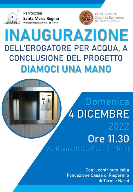 TERNI- Domani, alle ore 11.30, inaugurazione dell’erogatore per acqua alla parrocchia di Santa Maria Regine, a conclusione del progetto “diamoci una mano”, con il contributo della Fondazione Cassa di Risparmio di Terni e Narni.