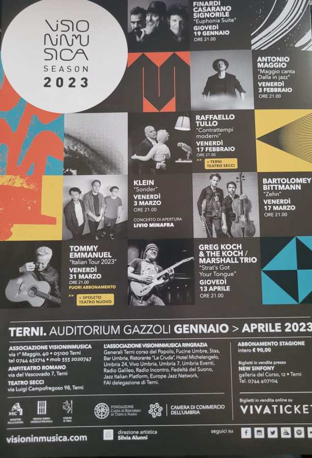 Infine, ecco il programma per la stagione 2023 di Visioninmusica con tutti i suoi vari appuntamenti all’auditorium Gazzoli da gennaio ad aprile. Si inizia con “Euphonia Suite” di Finardi Casarano Signorile, passando poi per “Maggio canta Dalla in Jazz” di Antonio Maggio, “Contrattempi moderni” di Raffaello Tullo (al teatro Secci), “Sonder” di Klein (con Livio Minafra in apertura), “Zehn” con i Bartolomey Bittmann, “Italian Tour 2023” di Tommy Emmanuel (al teatro Nuovo di Spoleto), per chiudere con “Strat’s got your tongue” di Greg Koch & The Koch Marshall Trio.