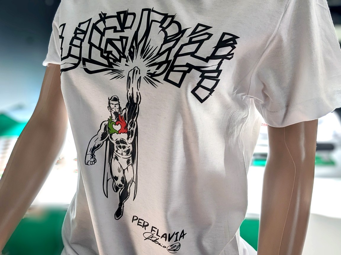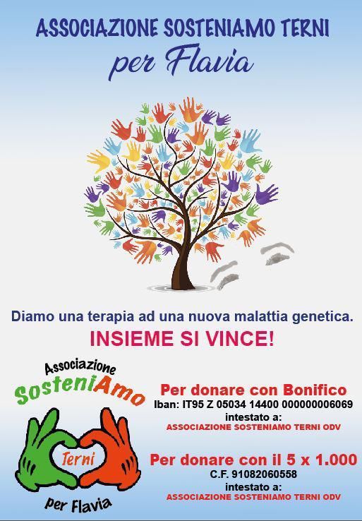L’opportunità di un approccio terapeutico a soli tre anni dalla descrizione della malattia di Flavia è stata accolta con grande entusiasmo dai suoi genitori e, quasi immediatamente alla presentazione del progetto, l’associazione Sosteniamo Terni, con il presidente Luca Angelelli e la vicepresidente Paola Bernardi, si è offerta di aiutarli a raggiungere l’obiettivo di finanziare questa ricerca scientifica. L’associazione Sosteniamo Terni, nata nel luglio 2021, si è già resa partecipe di molteplici raccolte fondi destinate al sostegno della popolazione locale, finanziando anche borse di studio riservate a ragazzi con basso reddito ma alto profitto scolastico. Per Flavia l’Associazione ha attivato con meticolosità e determinazione la raccolta dei quasi 200.000 euro necessari al finanziamento del progetto di cura, programmando spettacoli, cene di beneficienza e molti eventi sportivi. Per descrivere in modo chiaro il punto di arrivo, ovvero sconfiggere la malattia causata dalla delezione del gene UGDH, l’associazione insieme ad Antonio Gemmi, ha proposto di rappresentare questa scommessa. A tal fine è stata creata la “Super maglietta”, a firma di Antonio, dedicata a Flavia e dal forte impatto visivo.