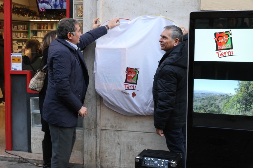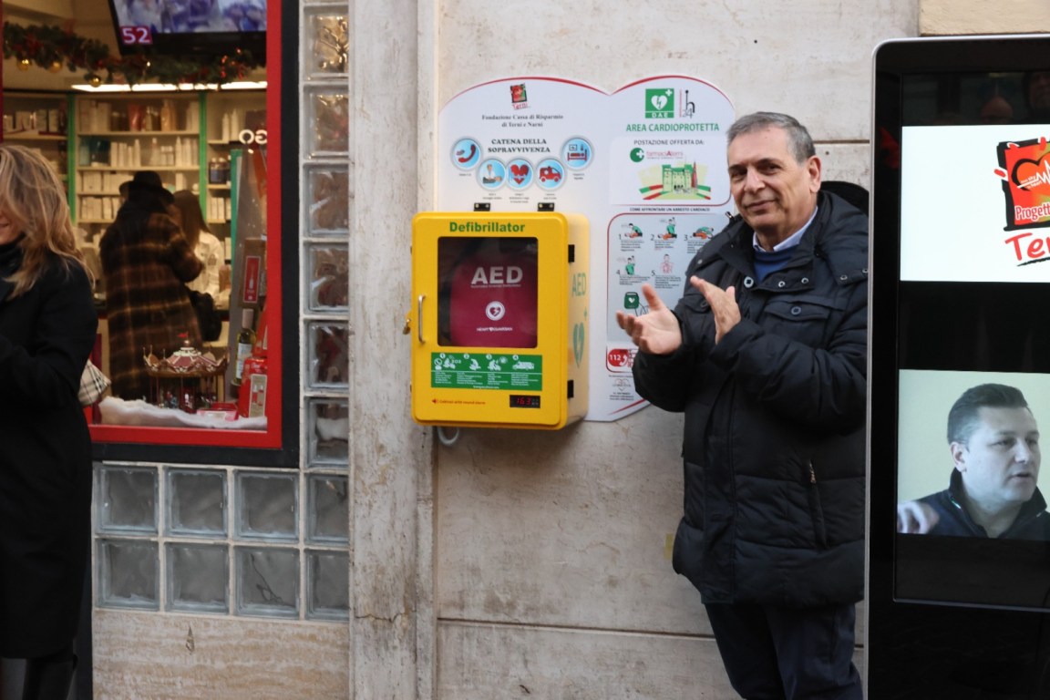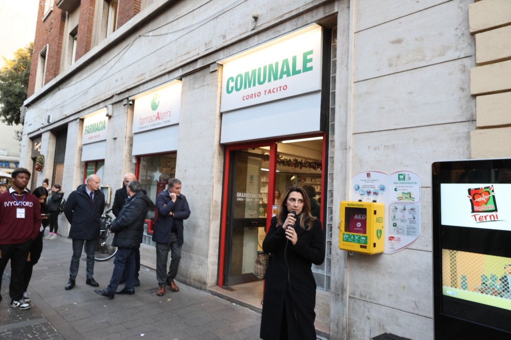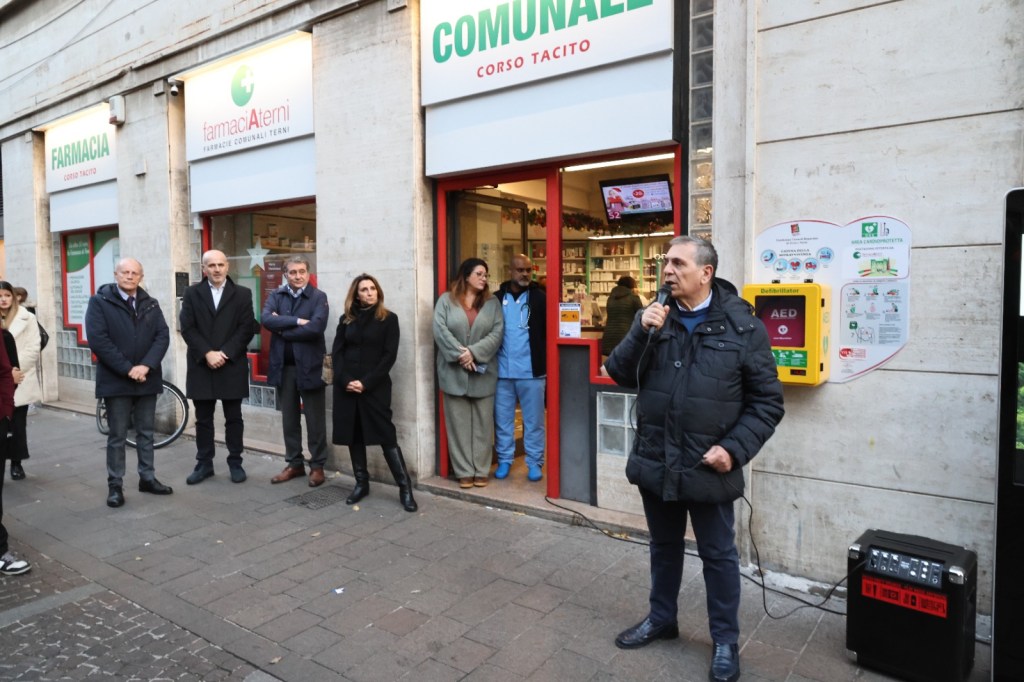 TERNI – Inaugurato a Corso Tacito il defibrillatore, posizionato accanto alla farmacia comunale. L’iniziativa (del Comune di Terni a cui hanno partecipato la Fondazione Carit e FarmaciaTerni) rientra nel progetto “Volontari del cuore”, che ha avuto tra gli altri sostenitori le associazioni Pandora, Amatori Podistica Terni, RelAzion’Arti, Ambulaife, Agesci 3 Terni, Terni al Centro, Acsi Terzo Settore, L’Aiutarella, l’Itt Allievi-Sangallo.