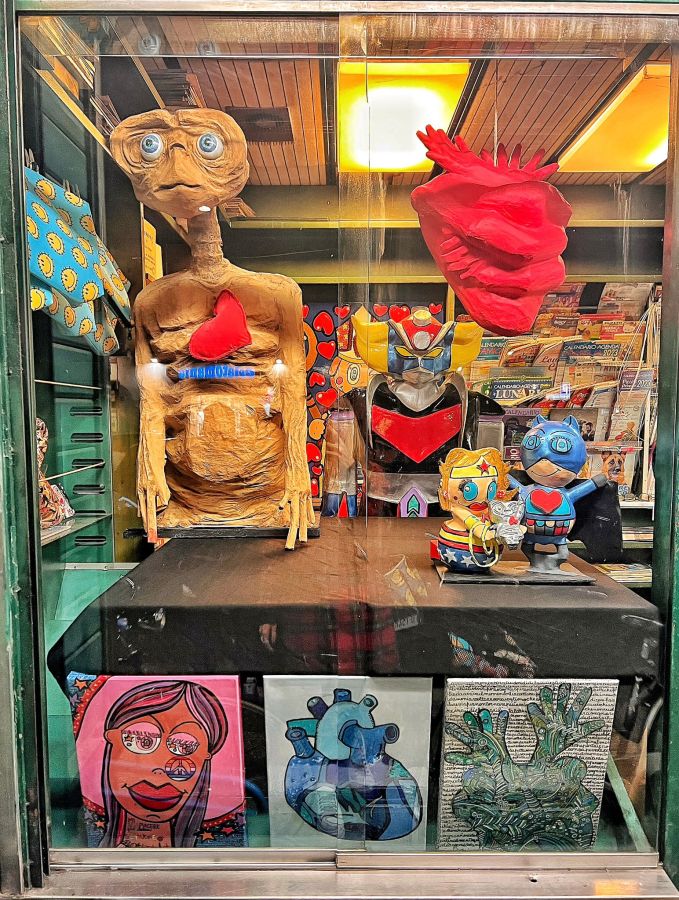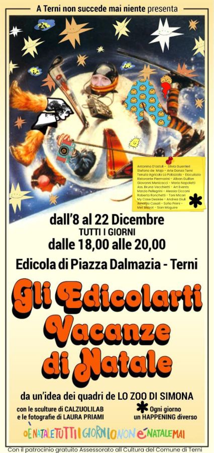 «Il chiosco dei giornali, con le sue vetrine e i suoi espositori, si rivela il luogo perfetto per l’arte da passeggio e di passaggio, un modo diverso e nuovo di fruirla, anche per chi non avrebbe mai immaginato di trovare forme artistiche in quel contesto». Perciò, tutti intorno all’edicola, fino al 22 dicembre, per ammirare i quadri e gli oggetti de Lo Zoo di Simona (@zonaduomo), le sculture in cartapesta di @Calzuolilab, le fotografie in pezzi unici della toscana naturalizzata ternana Laura Priami (@laurapriami), le poesie in dolce stil novo di Antonino Dastoli, i Tattoo di Sofia Primi (che si cancellano in una notte, il tempo di un sogno). E ancora le performance teatrali di Stefano de Majo e il teatrino di legno butai con storie kamishibai di Silvia Guerrieri e la presentazione dei libri di due autori romani, che hanno scelto Terni per l’evento: Marzio Pellegrini (10 Dicembre) e Alessandro Nicoloso (il 20 Dicembre).