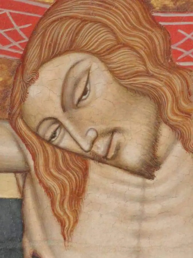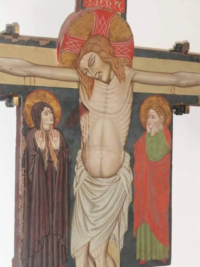 La croce, che noi proponiamo, proviene dalla chiesa Collegiata di Matterella di Matterella. Come detto e’ un pezzo raro, un “unicum”, espressione religiosa – popolare di tipo tradizionale del territorio spoletino a cavallo dal XIV/XV sec. La croce dipinta, di incerta datazione, ma per analogie stilistiche riferibile alla fine del XIV sec. rappresenta il Cristo crocifisso con le palpebre socchiuse, nella serenità della morte, ai fianchi la Madre e l’Apostolo Giovanni in atteggiamento di dolore composto, espresso per lo più dal movimento delle mani. Alle due estremità della linea della croce, in orizzontale, a sinistra e a destra nelle formelle laterali, due angeli raccolgono in un calice il sangue che fuoriesce dalle mani inchiodate del Cristo. In alto Dio Padre benedicente con la mano destra e con la sinistra sorregge il libro aperto; il cartaio con la scritta: JESUS NAZARENUS REX IUDEORUM sopra la scritta che circonda la testa del Cristo priva della corona di spine. In origine il pezzo era correlato da due angeli lignei policromi e genuflessi che fungevano da candelieri, disposti su piccole mensole. Non si puo’ affermare con esattezza chi sia l’ autore, la critica ufficiale l’ attribuisce al “Maestro di Cesi” (anonimo di scuola giottesca) o addirittura si attribuisce all’artista Leonessano . A questo artista è attribuita la pala in Santa Maria di Ponte a Borgo Cerreto con Croce dipinta; la pala Madonna in trono tra Angeli e Santi in due registri a Cesi; Altre due opere sono a Spoleto. Gli agiografi non azzardano molto sulla provenienza da Spoleto di questo Maestro: la fisionomia dell’ artista, letta attraverso le sue opere, e’ quella di un “umbro” che aggiorna il suo iconico arcaismo, consapevole anche di forme Cavalliniane con una lettura acerba, ma appassionata di Giotto. In questa Croce sagomata, i volti, le figure, il drappeggio dei tessuti che accolgono i personaggi posti ai lati, rendono nell’insieme un’apparente opera compiuta e armoniosa in contrasto con il colore ancora tenue che caratterizza, in parte, le linee anatomiche del corpo del Cristo assai marcate, con gli arti inferiori leggermente spostati verso destra. Comunque la staticità dei volumi, in analogia con varie opere coeve, si contraddistingue, in questo caso, dalla successione delle figure che circondano quella centrale, confortando la drammaticita’ del soggetto con piccoli spiragli di movimentata vitalità che si perde pero’ nella proporzione esagerata del nero chiodo che trafigge i piedi del Cristo. Le due figure ai lati sembrano, ma non lo sono, essere realizzate in una seconda fase, vista la diversità dei volumi e delle linee. Figure che si ritagliano in forme arcaiche a differenza invece del movimento del drappeggio e delle espressioni addolcite, evidenziate dai gesti delle mano. Lo sguardo assente accenna l’emozione dell’attimo che fugge agli occhi consapevoli della resurrezione dell’Uomo crocifisso seppur morto. Il volto della Madonna e evidenziato dalla luminosità dell’aureola leggermente protesa verso il crocifisso; accende una sorta di dialogo, seppur apparente, ma efficace irrompendo la staticità cromatica nell’insieme della rappresentazione.Da queste figure, l’autore accenna e azzarda una novità: uscire dallo schematismo che lo ha sempre legato a quelle linee arcaiche del genere pittorico dell’epoca, proiettandosi, forse inconsapevolmente, in nuovi orizzonti, anche se nel suo percorso artistico, seppur breve, vari sono stati i tentativi di perfezionamento stilistico. Ecco un altro gioiello che distingue Ferentillo, oltre a tante testimonianze sparse un po ovunque che sarebbe bene far conoscere soprattutto alle giovani generazioni