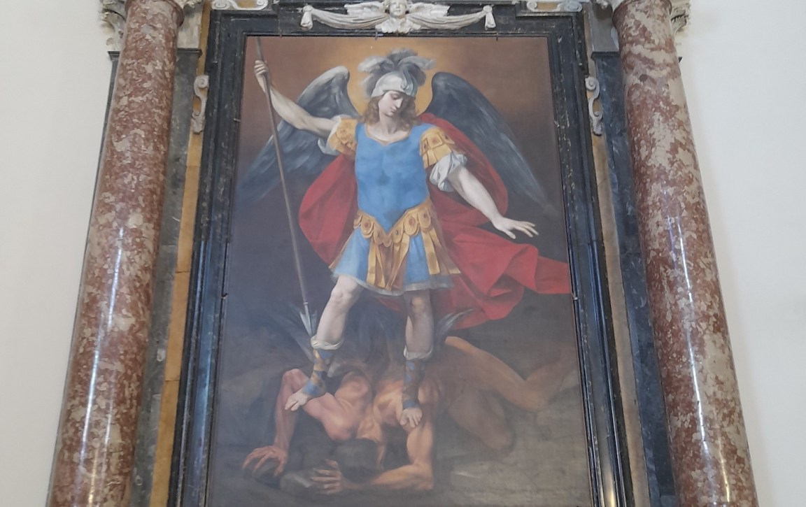 In occasione della festività di San Valentino patrono della città di Terni chi è che in questi giorni non visita o ha visitato la basilica dove riposano le spoglie del Santo dell’ Amore universale? Credo che tutti i ternani una volta nella vita abbiano varcato il portone della Basilica non solo per devozione, ma anche per ammirare l’interno e si siano persi nello scoprire opere d’ arte in essa contenute. Personalmente lo sguardo, senza dubbio, è stato catturato dalla prima cappella della navata, un tempo patronato della nobile e facoltosa, oltre che prestigiosa famiglia ternana degli Sciamanna. Ma andiamo con ordine. La cappella, possiamo dire monumentale, è dedicata a San Michele Arcangelo. L’ altare (nella foto) e’ stato realizzato tutto in marmo policromo. La pala di altare, dipinta su tela, raffigura appunto l’ Arcangelo Michele che uccide il demonio (nella foto). Michele indossa la classica corazza da guerriero romano di color azzurro, con tanto di elmo che lascia scendere sulle spalle la folta capigliatura bionda; con la mano destra impugna la classica lancia; alle spalle un mantello rosso paonazzo che lascia intravedere le scure ali piumate. Lucifero, sdraiato a terra, viene insidiato sulle spalle dall’ Arcangelo Michele. Bellissima ma austera espressione del volto dell’ Arcangelo fiero di domare e poi, uccidere Lucifero. Come detto, il dipinto è incastonato in marmi policromi dell’ altare della famiglia Sciamanna. Due colonne laterali con capitello corinzio danno solennità al tutto, trabeazione liscia e volute. L’ autore del dipinto è Giuseppe Cesari detto Cavalier D’Arpino ( nella foto) manierista, che per la sua talentuosa fu definito: PICTOR UNICUS TORUS ET EXCELLENS AC PRIMARIUS ET REPUTATUS. Nacque A Roma nel febbraio del 1568 e morì sempre a Eroga il 3 luglio del 1640. Il padre Mizio Cesari fu maestro dello stesso Michelangelo Merisi da Caravaggio. La nobile famiglia degli Sciamanna, ha voluto imprimere la sua presenza beneficiando la cappella con due monumenti assai preziosi a livello artistico e storico. Sulle due pareti troneggia i busti e lapidari di Ludovico Sciamanna e Brunoro Sciamanna (nelle foto). Il lapidario riporta tutti i titoli e le gesta dei due illustri personaggi con tanto di stemma quadripartito: nel primo e nel quarto un albero ramificato, nel secondo e terzo tre bande oblique o più identificati fiumi scorrenti (nella foto).