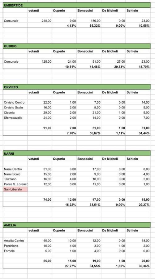Senza voler anticipare però le conclusioni, analizzando a volo d’uccello fatti e curiosità: Terni che vota Cuperlo è storia nuova ma anche un richiamo all’antico. Bonaccini che vince di misura su Schlein nel Ternano (388 a 309) dice che le sirene di una sinistra dura e pura da quelle parti si sentono meglio. O magari Bonaccini è stato percepito come sostenuto dall’ancien régime. Vai a capire. Però il risultato è rilevante anche a livello nazionale, perchè leggermente in controtendenza.