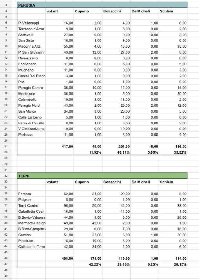 PERUGIA – Bene Bonaccini (52,68 %) con 1.594 voti, Schlein in media nazionale, senza acuti, con poche possibilità di recuperare con i gazebo, ma in posizione onorevole: 29.54%, 894 voti. Cuperlo c’è e lotta con noi, soprattutto base operaia ternana. Qualcosa come Ingrao ai bei tempi: 480 voti con il 15,86%. De Micheli solo in tracce: 58 voti, 1,52%.