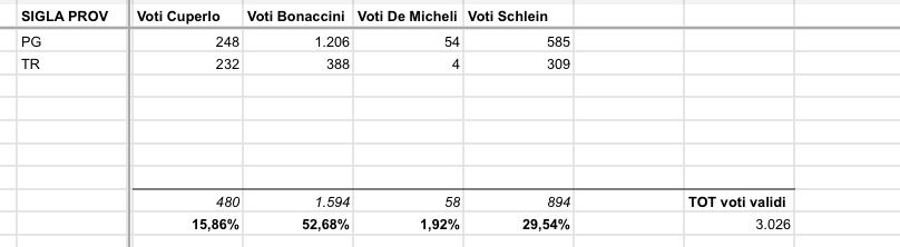 Su Perugia provincia non c’è stata partita: 1206 a 585. Con Cuperlo che ha preso appena una manciata di voti in più rispetto a Terni. In tutta la provincia di Terni solo 4 persone fisiche hanno votato De Micheli (fuori i nomi, ahahah).