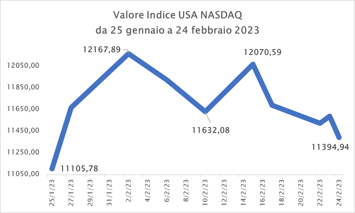 Era il 1980 quando Renzo Arbore invitava gli italiani a fidarsi della bontà e genuinità di questa bevanda antica come la storia dell’uomo in una memorabile campagna pubblicitaria per AssoBirra entrata nella storia del costume italiano. Ora lo stesso invito va in parte rivolto a chi si affida a facili entusiasmi in campo finanziario. Non perché siano mutate le prospettive delle economie e dei mercati finanziari, ma perché la completa uscita dal tunnel, come spesso si suole dire, non è del tutto completata. Manca anche un tassello, certamente tutt’altro che secondario, la fine della guerra nell’estremo oriente europeo. Accanto alla possibilità che una parte importante della popolazione europea, soprattutto, sia in grado di mantenere, nei prossimi mesi, la propensione ai consumi, come negli anni passati. Sotto è riportato graficamente l’incerto incedere dell’indice statunitense, votato prevalentemente alla quotazione delle aziende tecnologiche: l’andamento del grafico stesso rappresenta bene, come nell’arco di un mese di scambi, l’umore muti con tanta rapidità.