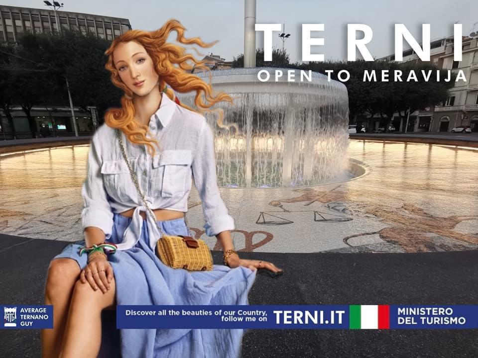 TERNI – La Venere di Sandro Botticelli in jeans arriva a Terni, si siede sul bordo della fontana di piazza Tacito poi va a mangiare una pizza vicino a palazzo Spada, prosegue il tour e si noleggia una bici alla velostazione, raggiunge il monumento di Miniucchi e si fa un selfie per poi finire il tour davanti alla Cascata delle Marmore sfoggiando una t-shirt bianca con scritto ‘Terni’.