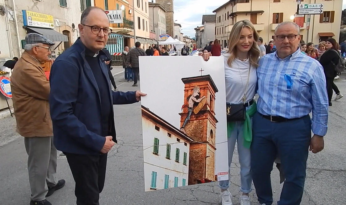 Terminato il rito religioso, il vicesindaco di Umbertide Annalisa Mierla e il presidente della proloco di Pierantonio, Marcello Fiorucci, hanno donato all’arcivescovo Maffeis una riproduzione dell’opera realizzata dall’artista Marco “Pic” Piccioloni, nella quale il campanile “ferito” di Pierantonio viene simbolicamente curato dalle ferite provocate dal terremoto.