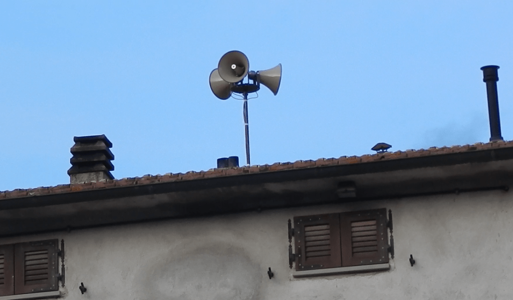 UMBERTIDE (Perugia) – A ogni rintocco un tuffo al cuore nel ricordo dei giorni prima del terremoto, quando la vita scorreva tranquilla e serena. A Pierantonio sono tornate finalmente a suonare le campane, in attesa che il campanile della frazione, fortemente danneggiato dalle scosse del 9 marzo, venga messo in sicurezza e ingabbiato. Lo scandire delle ore e dei giorni di festa, dal 28 aprile, viene provvisoriamente affidato a tre altoparlanti posizionati sul tetto di una casa all’inizio del centro storico del paese messo in ginocchio dal terremoto che riproducono il suono delle melodie ridondanti delle squille.