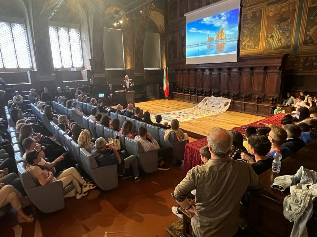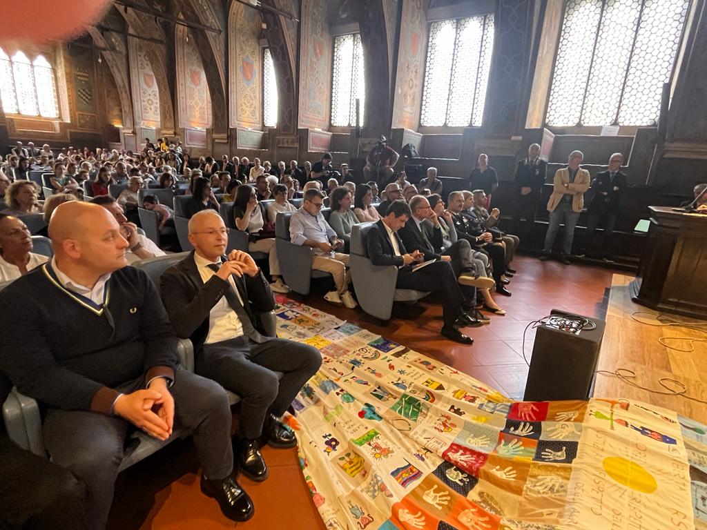 Nel pomeriggio, la sala dei Notari di Palazzo dei Priori si è riempita dei colori della “coperta della legalità”, realizzata dagli studenti e «specchio dei loro pensieri», oltre che «simbolo della comunità educante», come detto dal preside Gallina.