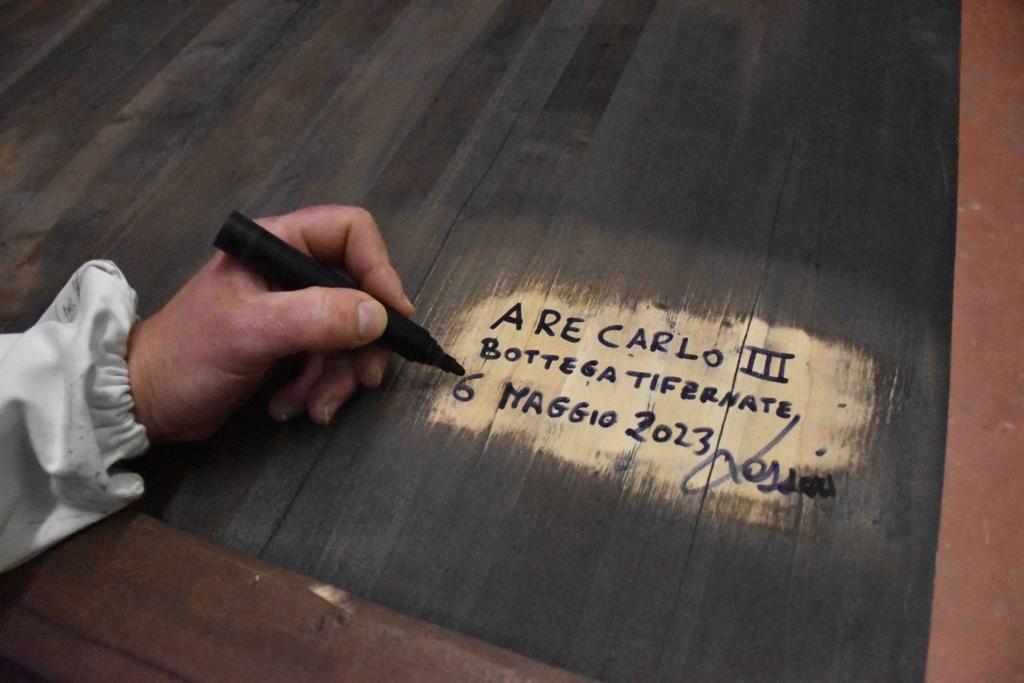 Alla vigilia dell’incoronazione di Carlo, in “bottega” (unici a livello mondiale nel riprodurre manualmente, grazie ad una tecnica brevettata, la “pictografia”, qualsiasi opera d’arte su supporti originari) si sono svolte le ultime fasi di preparazione dell’opera con tanto di firma e dedica a Re Carlo III sul retro dell’enorme “pala”. Prima dell’imballaggio ed imminente invio con un volo di sola andata per Londra, tutti i collaboratori della Bottega Tifernate hanno voluto rendere omaggio al Re, alla famiglia reale, al popolo inglese, posando per una foto ricordo accanto al dipinto “mozzafiato” sulle note dell’inno nazionale inglese, “God Save the King”, realizzato in maniera magistrale dal maestro, Fabio Battistelli, con il suo clarinetto seguito subito dopo dall’interpretazione dell’Inno di Mameli a sugellare la storica amicizia e vicinanza fra Italia e Gran Bretagna.