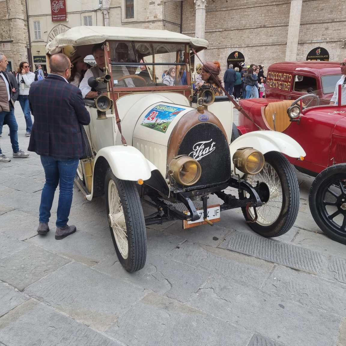 Scherzate: c’è il primo Suv della storia. E’ Fiat. Sopra tutta una famiglia vestita inizio secolo (il ‘900, sia chiaro). Passa una Mg anni Trenta col seggiolino per bimbo. Seguite il blu: un signore distinto che sa pure due parole di italiano, il quale spiega: «Io venuto qui dal Belgio, senza cappello, senza capote. No paura di piove». E’ lui il mago della pioggia, con signora sorridente. Venite sempre da noi (il cielo è grigio sempre più scuro ma il pomeriggio è salvo).