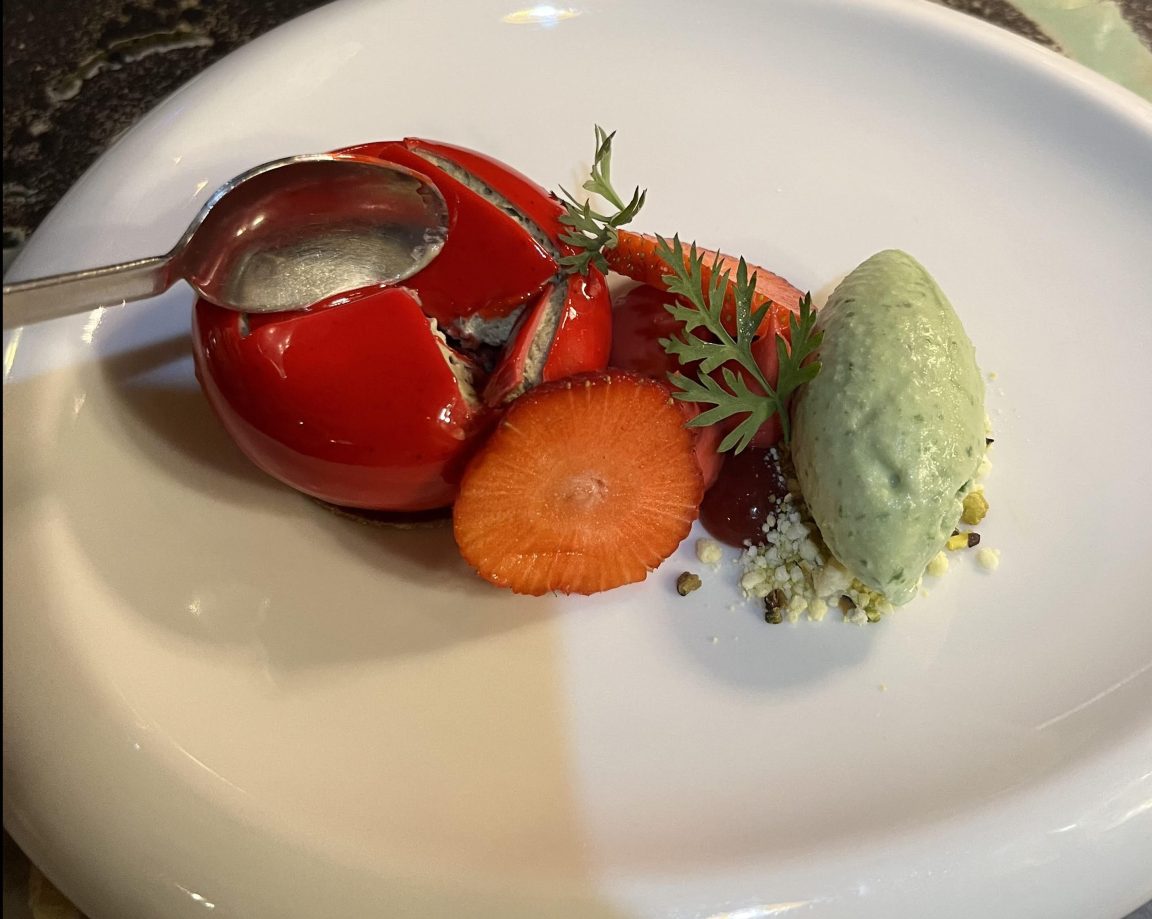 In chiusura non poteva mancare il dolce. Il primo della lista è quello che sentiamo di consigliare: Benvenuta primavera!. Una bavarese al pistacchio con cuore di fragola, gel di fragole e gelato al basilico. Fresco, strutturato e goloso tutti insieme. Il gelato al basilico chiude perfettamente la bocca ad una cena buonissima.
