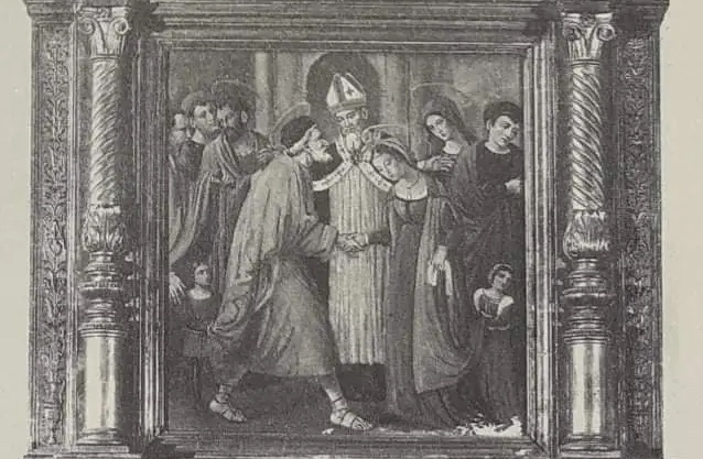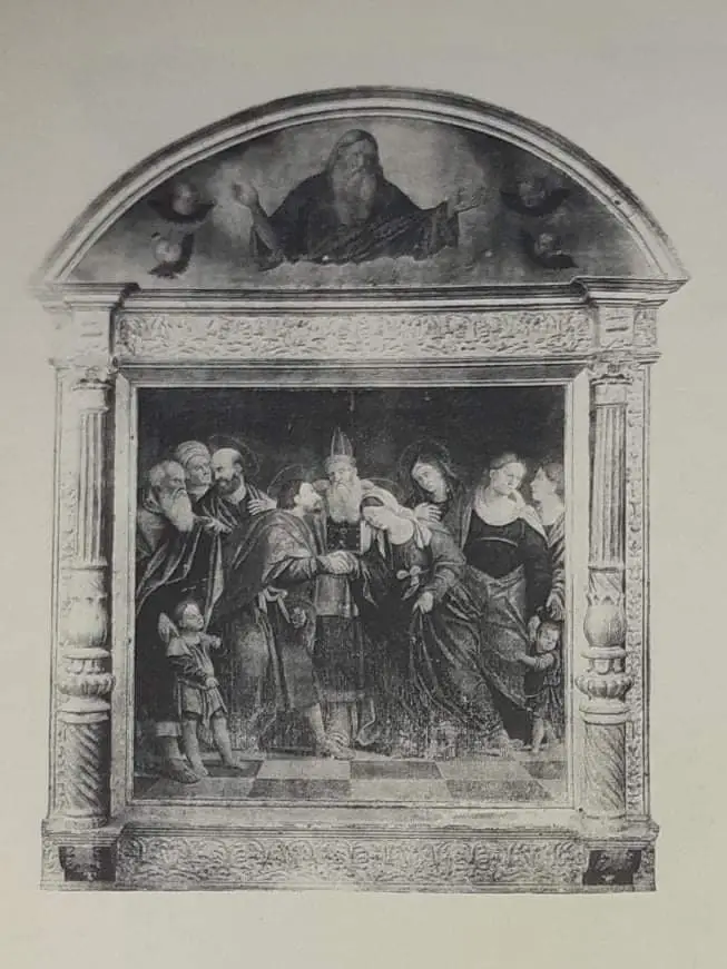 Il dipinto del XVI secolo, (come ci riferisce la Prof. Giovanna Sapori (nel volume la chiesa Parrocchiale di Santa Maria Assunta di Arrone), era già citata ai primi del XVII secolo. La sua collocazione, dapprima era sull’ abside destra, e successivamente in una delle cappelle di sinistra. L’ immagine numero (1) e’ quella scattata dall’ Istituto Centrale del restauro nel 1924/25; nel 1957 lo stesso dipinto fu pubblicato e attribuito al Santa Croce da Bernard Berenson visto in una collezione privata. Quindi l’ opera scomparve tra il 1924/25 e il 1957. Oggi abbiamo una copia dello sposalizio. L’ autore di questo bellissimo dipinto, Girolamo da Santacroce, nasce a Venezia e morirà nel 1556. Il dipinto fu eseguito forse tra il 1540/1550. Probabilmente il dipinto era destinato ad una devozione di altare di una cappella privata, viste le dimensioni ridotte e la cornice a tempietto. Un genere che all’epoca andava assai ricercato per le cappelle private di nobili o di famiglie facoltose. Molto probabilmente la provenienza da Venezia fino ad Arrone, potrebbe essere stata commissionata dalla stessa famiglia degli Arroni e successivamente donata alla chiesa dove avevano le loro devozioni e benefici. Ma andiamo a conoscere, in breve, l’artista di questa opera. Il Santacroce fu allievo di Gentile e Giovanni Bellini.
