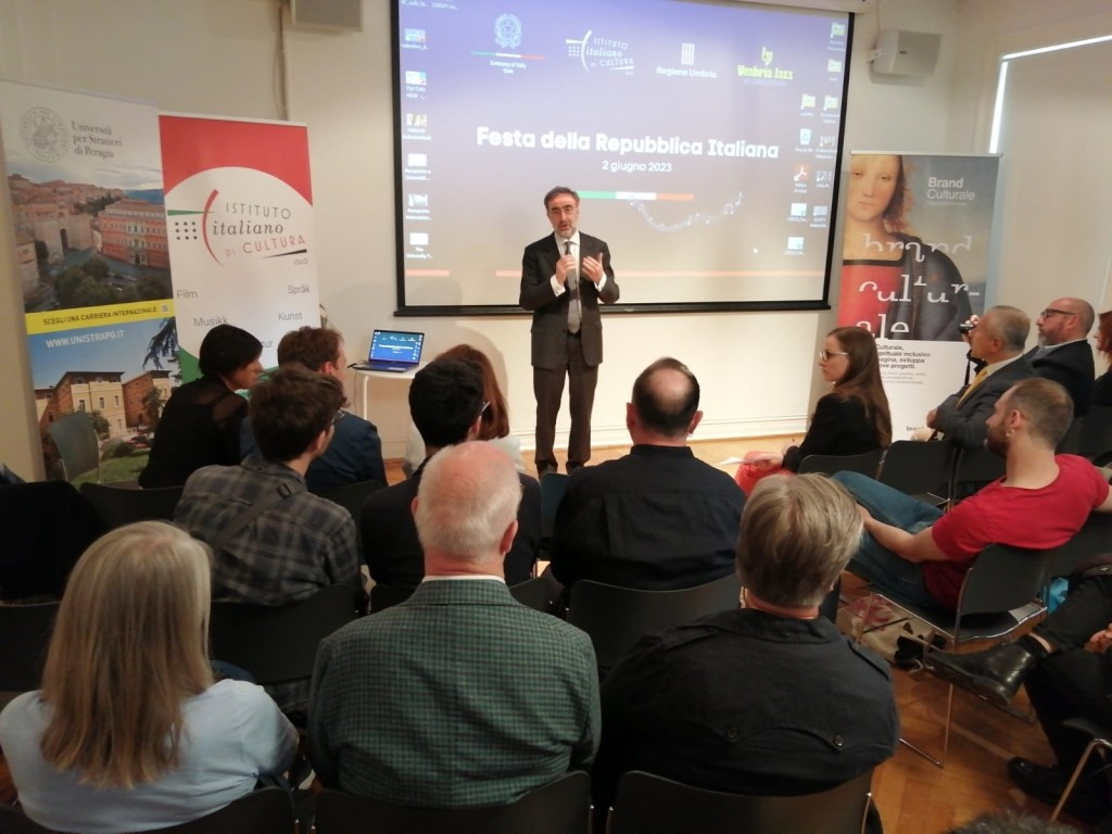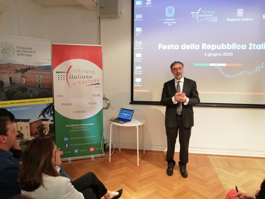 Progettata e organizzata dall’hub creativo “Brand Culturale”, l’iniziativa è stata parte della missione istituzionale che ha portato le eccellenze del territorio umbro in terra norvegese in occasione delle celebrazioni del 2 giugno. Stefano Nicoletti, ambasciatore d’Italia ad Oslo, e Raffaella Giampaola, direttrice del locale Istituto italiano di cultura, hanno coordinato gli interventi della serata, aprendo l’incontro con la lettura di un messaggio di plauso all’iniziativa, inviato dal Ministro degli affari esteri Antonio Tajani, nel quale si sottolinea il valore delle Università nella “diplomazia della crescita” del paese, ed in particolare di quello dell’Università per Stranieri di Perugia – scrive il Ministro -, quale «storica realtà umbra [che] gode di una reputazione di primo piano nell’insegnamento della lingua italiana e collabora proficuamente con il Ministero degli Esteri alle numerose iniziative di diffusione della lingua e cultura italiane nel mondo».