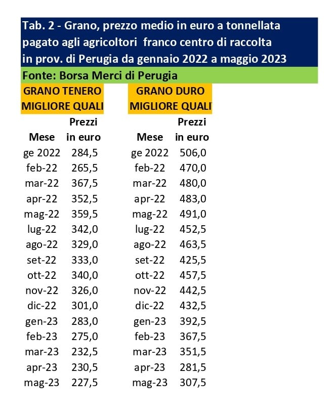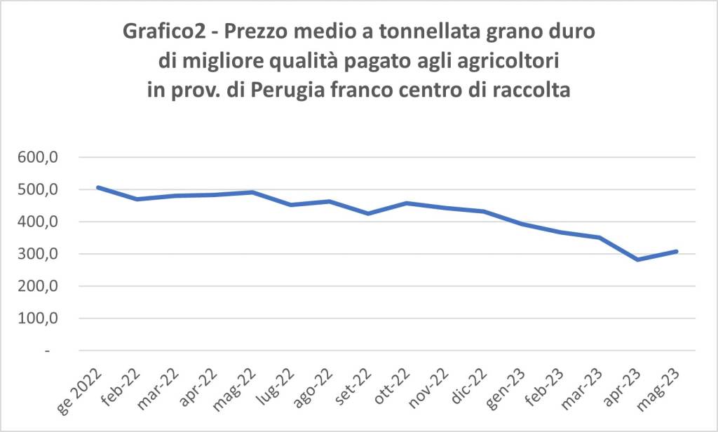 L’ultimo Listino pubblicato dalla Borsa Merci di Perugia è relativo al 30 maggio 2023 e quota il grano duro di migliore qualità al prezzo medio (come detto riconosciuto all’agricoltore, franco consegna ai centri di raccolta) a 307,5 euro a tonnellata (frutto di un prezzo minimo indicato a 305 euro e di uno massimo di 310 euro), con una riduzione del 37,4% rispetto a un anno fa, a maggio 2022, quando quotava 491 euro. Il prezzo del grano duro in provincia di Perugia (e per estensione in Umbria), sempre riconosciuto all’agricoltore, come si può vedere dalla Tabella 2 e dal Grafico 2 ha risentito poco, a differenza del grano tenero, dallo scoppio della guerra in Ucraina, arrivando dopo l’invasione russa a un massimo di 491 euro (sempre valore medio a tonnellata) a maggio 2022, rispetto ai 470 che quotava a febbraio 2022, mese dell’inizio dell’attacco russo. In precedenza, a gennaio, il grano duro di migliore quotava in media 506 euro.