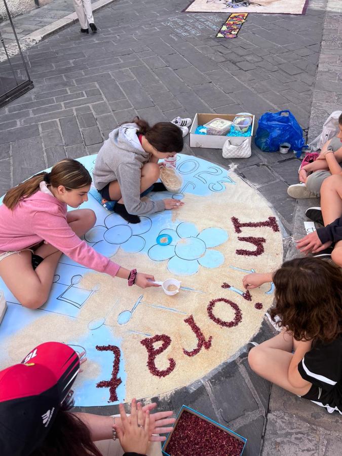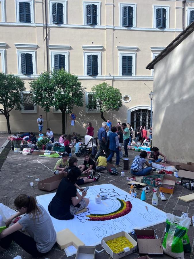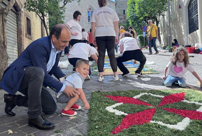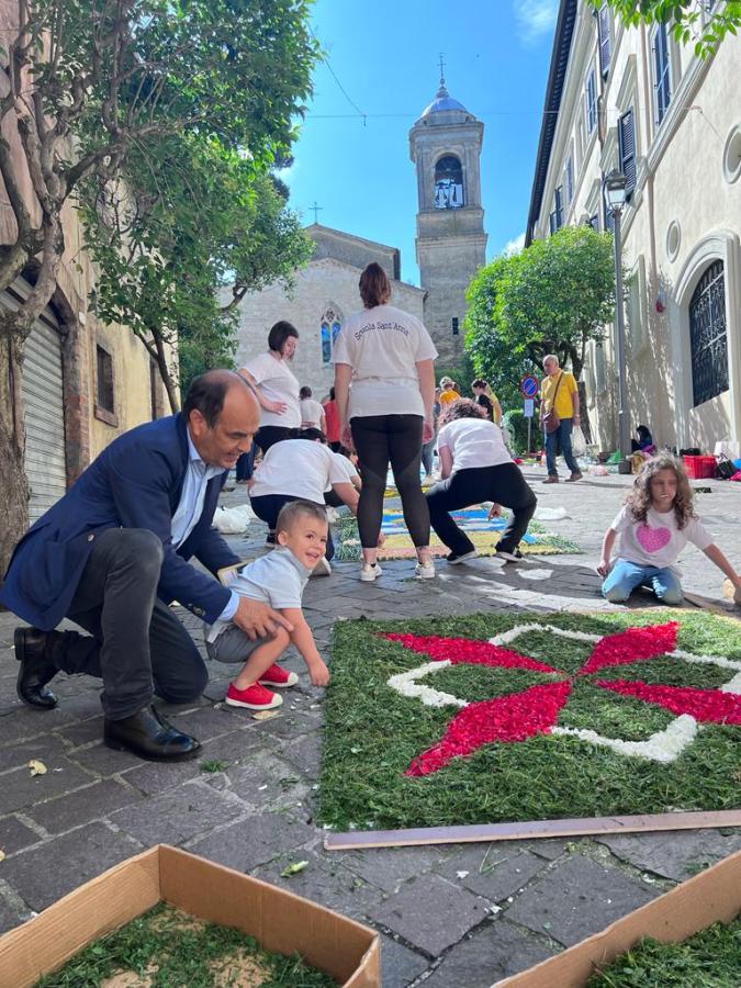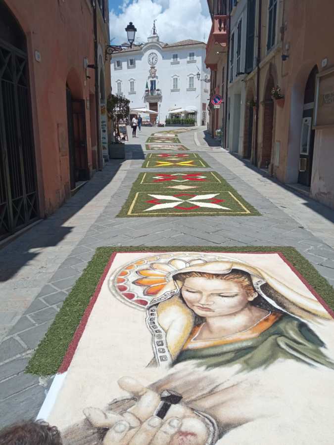 TERNI – Nonostante il temporale di sabato pomeriggio, alle 11 di domenica l’opera degli infioratori di San Gemini ha pervaso di profumi e colori la cittadina umbra. «Per la messa in Duomo delle 17 e la processione del Corpus Domini che parte dalla cattedrale alle 18, l’opera sarà terminata». Marina Bartollini, del Groppo infioratori di San Gemini, presenta la 26esima edizione della manifestazione che affonda le sue radici nella tradizione popolare del borgo medievale. Un lavoro che per tutta la notte duecento sangeminesi, cento ragazzi del catechismo e altrettanti studenti delle scuole elementari e medie, hanno portato avanti con passione. Anche il sindaco Luciano Clementella era lì: «Non ho contribuito alla realizzazione del tappeto di fiori lungo quasi un chilometro e mezzo, ma ho assistito godendomi l’entusiasmo dei più piccini e la maestria dei più esperti».