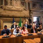 Oltre la Giunta, l’altra donna che siede al tavolo del sindaco è la neo eletta presidente del consiglio comunale Sara Francescangeli di rosa vestita: tailleur cn pantalone rosa acceso e sotto-giacca nero: “Mi volevo far notare”, ha detto. Per lei anche ventaglio in tinta rosa a pois bianchi. Da notare che è la prima donna a palazzo Spada a ricoprire il ruolo di presidente del consiglio comunale.
